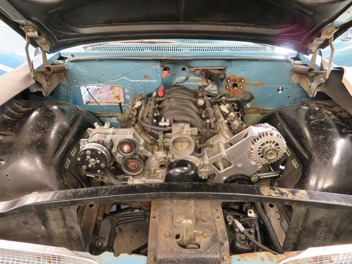 As of current, it has an LS1, 4L60E, Ford 9", Ridetech coil over suspension front and rear, and 4 wheel disc brakes. It's been a great car to bang around in. My wife and I have enjoyed the car immensely, but my tastes have changed a bit as well as my expectations from my cars. I am sick of 2pc driveshafts and a frame that has the rigidity of noodles. So...............having said that...........it's time to blow it apart for the next phase. I will keep the original paint, and the overall look of the car won't change much. I'll even see how much of the original interior I elect to maintain. That's where it stops. My goal is to improve the car in these areas. -Handling. A nice stiff chassis to take the squeaks and rattles out of the car and maintain a great ride quality. Not that I plan to autocross this, there is definitely room for improvement. I am thinking a 12" wide rear tire which may require mini tubs. 10" wide rubber in the front. -Braking. It stops well now, it can be better. An engineered chassis and brake system will improve overall braking and thus predictability. I'll be limited in brakes as I am going to maintain a 15" wheel so I have no issue with the hardcore 1964 and earlier events. (I'll just keep the hood closed) -Comfort. Vintage Air HVAC as well as revisiting the seats. I am wanting to keep the bench seats and the overall feel of the interior. Modern foam in the seat so as I feel a bit more "planted" while in it. I suppose there may be some mods to the seat frame so I can get some lumbar support and perhaps a bit better ergonomics. We will see there. LOTS of sound deadener! -Power. Here is the subject I have been struggling with. My inner cheap speaks LS3 to me.............................my inner child screams LT4! The jury is still out but I am leaning to the LT4. -Theme. The theme wont necessarily change much. I want a car that looks like it got parked in the mid 60's, and then recommissioned recently. My original vision was a car that could have been parked around Gasoline Alley in mid May of 63-65. On the docket........................ 1. Roadster Shop chassis 2. GM Connect & Cruise power 3. Refinish the underside and engine compartment to the standards of a modern build. I am drawn to the Stielow OE feel and sensibility (sorry if it sounds a bit creepy and stalker like Mark!) What I started with years ago............ http://i1043.photobucket.com/albums/...psococ6mfh.jpg http://i1043.photobucket.com/albums/...psykamgby4.jpg http://i1043.photobucket.com/albums/...pssccmi8ml.jpg http://i1043.photobucket.com/albums/...psemrmpxvg.jpg As I write this before I start disassembly..................... http://i1043.photobucket.com/albums/...psq2o16s32.jpg http://i1043.photobucket.com/albums/...psifttp9a7.jpg http://i1043.photobucket.com/albums/...psffmmyp3s.jpg http://i1043.photobucket.com/albums/...psz0wur5na.jpg http://i1043.photobucket.com/albums/...pspc3daiww.jpg |