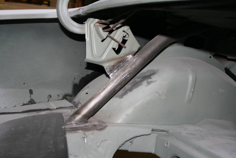 The reproduction floor included a brace that I assume was for convertibles that we had to remove (that is the unprimered section) – there are enough double panels back there without one more that we don’t need.