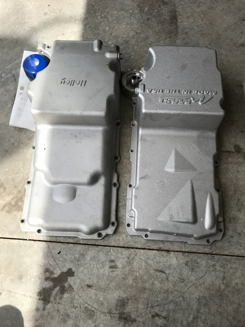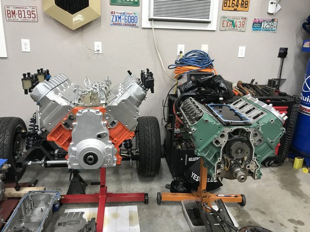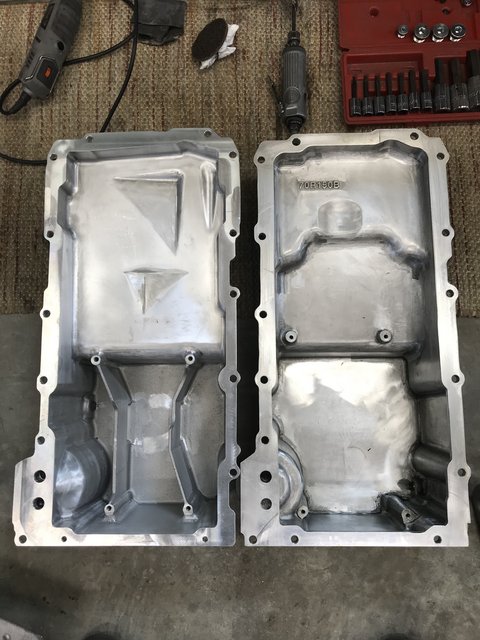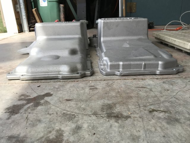 https://i.postimg.cc/BbVn534q/01-F7-...B0-DD11-F2.jpg This is a Blueprint engines 427 LS. 625HP and 565 ft. Lbs of torque. I’m using their long block so I could select the external items to fit my needs. Its a LS3 based stroker that has an all forged bottom end, Mahle forged pistons and rings, ARP rod bolts, Melling oil pump, and 12 degree 255 cylinder heads that rotates the valve angle from the 15 degree angle of the standard LS3 to similar to the LS7. The old and the new. https://i.postimg.cc/TYBPpTt0/FA5-AB...0-E6-FA364.jpg The one thing I missed during mock up that caused lots of head scratching and some challenges to overcome was the oil pan. I had a Holley 302-2 oil pan I used to mock up and it fit great. The longer stroke of the new engine didn’t clear the pan. The new Holley pan 302-3 is good for up to 4.00” stroke but I am at 4.125” stroke. The original Holley pan 302-1 would work for the engine, but the sump is too deep for my liking and hung below the cross member. In addition the front of the pan was to deep for my steering rack. So after looking into lots of oil pans I selected the Mast Motorsports stroker pan. I prefer the cast pans and it had all the clearance I needed or so I thought. For those studying oil pans here is a comparison to the 302-2 Holley pan. https://i.postimg.cc/3wTJFn5D/14-D2-...-A60-CD1-A.jpg https://i.postimg.cc/bYCrfxbK/EE9600...4-F1-C06-A.jpg https://i.postimg.cc/VkyYzDNH/0114-C...1077-C09-B.jpg The Mast pans have those kick outs in just the right places to clear the rods. I am using their pickup and windage tray as well, all designed for the longer stroke. The only thing I didn’t like about the pan is the cast in baffles but no trap doors for oil control. I was using the Improved Racing baffle trap door assembly in the Holley pan and I really liked it. |