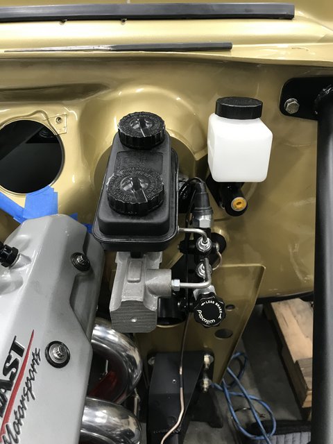 https://i.postimg.cc/JnKNLscP/16783-...D8127875-A.jpg https://i.postimg.cc/HxTwRw5r/FD81-D...DBB9724962.jpg I am using a compact 3/4” Wilwood clutch master 260-13619. It is setup for a 3/8-24 Banjo fitting. I am going manual brakes and would normally use a Wilwood master cylinder for the brakes. I have used them in the past and my only complaint is the lid. I guess it’s a pet peeve, but I don’t like to use tools to remove a lid to check the fluid level. The mounting location is very close to the left valve cover so I researched an alternative. I ended up using Dorman M39736 that was used on 87-95’ Dodge and Chrysler vehicles. It has the 7/8” bore size I wanted, its compact and aluminum. The side benefit is its cheap ($39.00) and readily available. The hole spacing is just a little tighter than GM, but its Easy to open up a bit to fit. I used a universal pushrod from Wilwood. I know the risk is low but I always think about what could happen if the rod came out of the master cylinder. I weld a washer to the rod and then drill and tap the back of the master cylinder to accept a washer that has a hole smaller than the washer I welded on the rod. No chance of it coming out! https://i.postimg.cc/x8CKT96Y/C0-D41...26610-D2-E.jpg https://i.postimg.cc/RCs7pn00/3-A1-D...F92-B321-F.jpg https://i.postimg.cc/Fs9yFTj6/472-CB...13043-FACA.jpg I’m using a Wilwood proportioning valve and I had to cut the mounting bracket and extend it some to fit. |