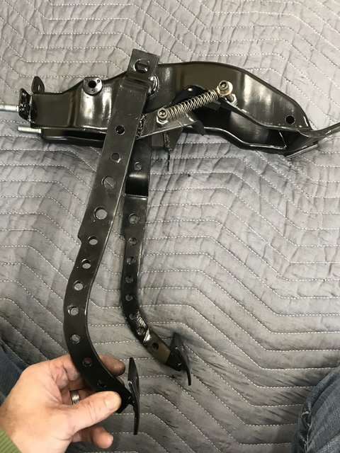 Picture of the brake and clutch pedals. I had to drill a few holes to improve the looks and decrease the weight. :) The clutch pedal required some changes . I raised the clutch pick-up point higher to better align with the clutch master cylinder this caused me to remove part of the clutch stop arm. I cut back the area to reduce the thickness to allow the yoke to go around then beefed up the welds. I use Wilwood yokes for the brake and clutch as they are aluminum and just work well.