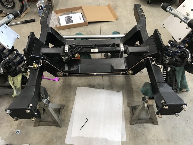 I looked into three suspension manufactures ( Detroit Speed, TCI and Speedway Motors. I based my decisions on quality, features, capabilities and price. Ultimately I felt like the Speedway Motors G-comp offered the best bang for the buck. I opted for the Unser Edition. It uses a fabricated spindle that has a bolt in C-7 Corvette hub and wheel bearings, billet steering rack and sway bar mounts, aluminum coil over uprights that tie to the down bars and a aluminum crossbar that ties the uprights together. I have had good experience with Ridetech coil overs so I choose to use them front and back.