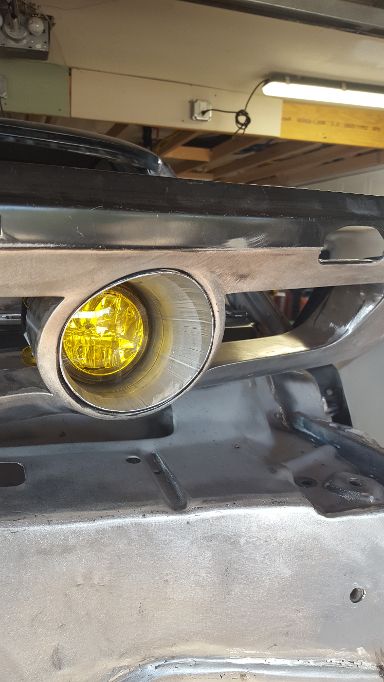 I knew I wanted to run some yellow fog lights in the location of the original parking light/turn signals but I wasn't sure how I was going to do it. I ordered a set of yellow fog lights for a stock Jeep Wrangler. The original opening for the lights was about a 1/2 larger than the Jeep lights. Wasn't sure of the best way to close this gap so I bought a set of 5 inch into 4 1/2 diesel exhaust pipe transitions and grafted them into place. Then fabbed some mounting tabs to attach the fog lights and keep them adjustable.