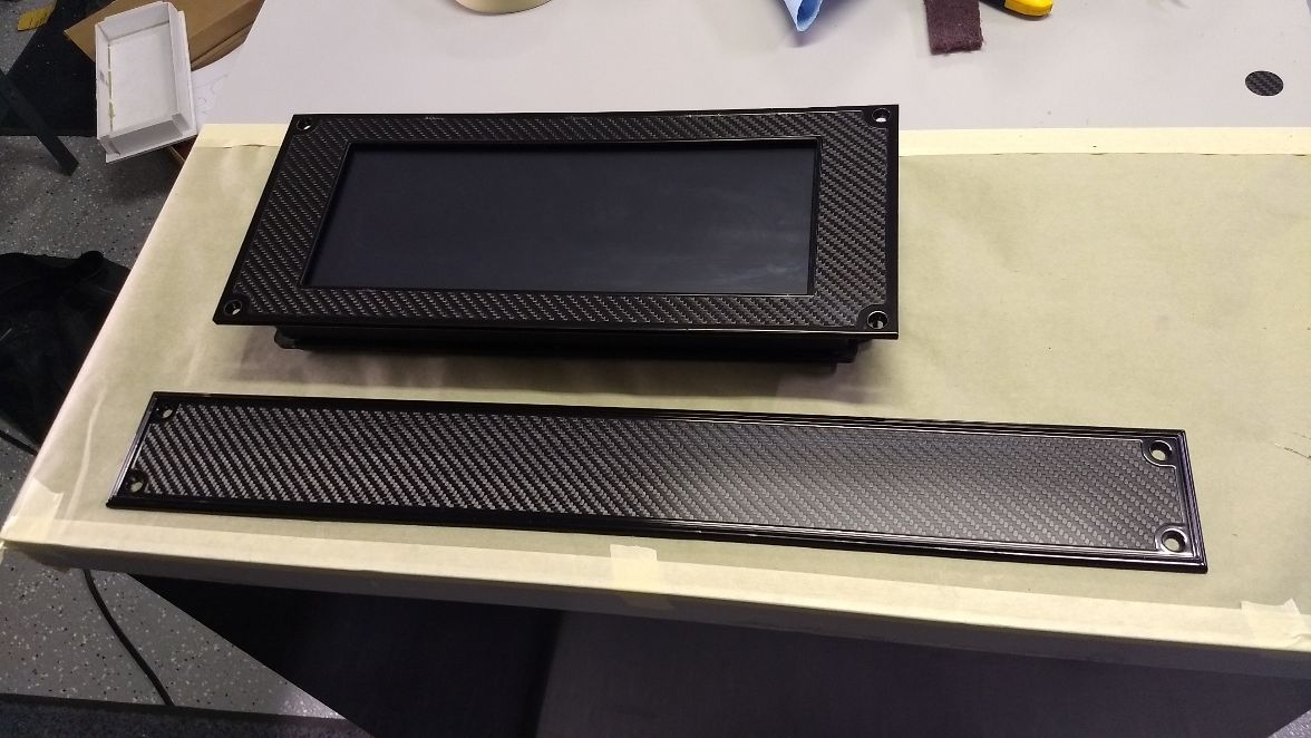 In an earlier post I mentioned I am trying to keep the interior very close to classic with a few modern touches like adding the Holley 12.3 Pro Dash. I also wanted the two center A/C ducts to appear similiar to original but I can't stand the poor fitment into the dash pad. I fabricated a steel pocket and welded it to the dash. I used some stamped recessed panels from Holohans Hot Rods to install the Vintage Air rectangle vents. I cut the crap out of DSE steel dash insert and modified it to my liking. Some custom CNC and carbon fiber work and I now had a matching bezel for my Holley dash and the passenger side dash plaque and grab handle.