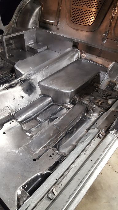 Rear seate delete. This will house the battery, amps and some other electronic goodies. I raised the floor and the sides of the tunnel to help tuck the 3 inch exhaust and Borla mufflers. I made the muffler pockets extra tall so I can also add some heat sheilds to the mufflers as well. Help keep heat out of the electronics area. That piece in the center with over 100 small bow ties cut into is the speaker grill for the 10 inch subwoofer. 1/8 thick aluminum that was laser cut. There is matching laser cut grilles for the speakers in the package tray also. The bow ties are even smaller.