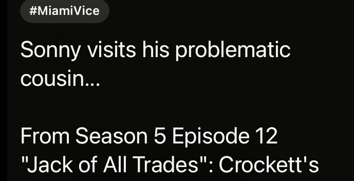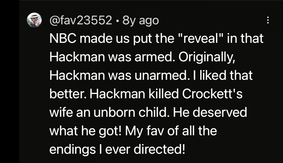 Crockett confronts the man who murdered his wife (played by singer Sheena Easton) and unborn child. The crucifix Crockett shows him was given to him by Hackman in an earlier episode when Sonny misguidedly got the guy exonerated for another murder.