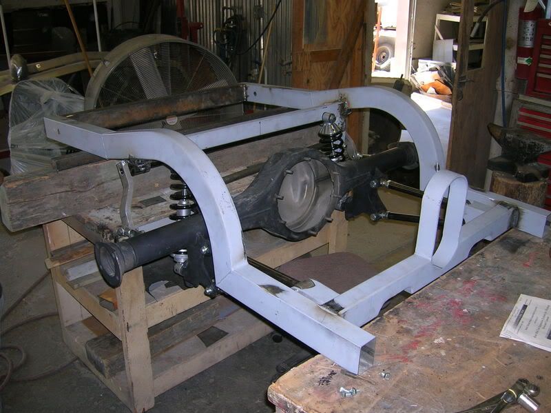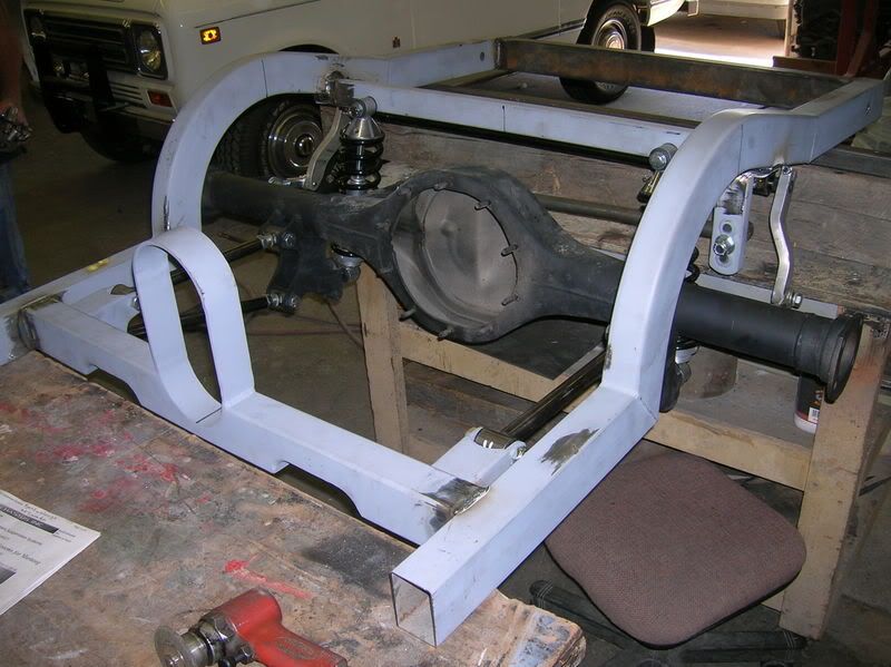 However, I ran into a few difficulties - first, the rear frame rails swing outward 1/2 way through the rear wheel opening, severely cutting into the space for the wheel and tire. Secondly, there was no good way to make /or adapt a bracket to move the leaf springs without binding it up at the front eye. So I got a little radical here. I ordered a 4-link setup from Martz Chassis and a set of Competition Engineering Formed rear frame rails. I cut the factory rails completely out and used the CE ones to get rid of the factory flair out. I then attached the Martz setup to the CE frame. Since I was going that far anyways, the 8.5 10-bolt was replaced with a 9-inch too at this time. http://i168.photobucket.com/albums/u...A/IMG_3055.jpg http://i168.photobucket.com/albums/u...TA/0606092.jpg http://i168.photobucket.com/albums/u...TA/0606091.jpg |