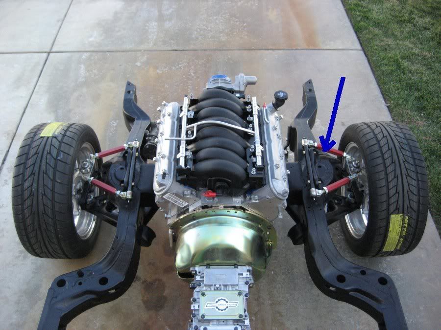 It appears you are running Global West CNR-42 upper arms (originally intended for B-body spindles) and what I'm guessing are ATS "tall" spindles. Just a warning... you may be in for a surprise at the alignment shop with that combo. Mark from SC&C and I were just working on this very problem (I'm changing from B-body spindles to ATS tall spindles, I already have the GW upper & lower arms on the car with B-spindles currently) and even with no shims the least negative camber I would be able to achieve with the GW CNR-42 upper arms is -2.2 degrees. The ATS spindles have 2 degrees less KPI than the B-body spindles-- thus the moment you bolt the ATS spindles on you now have 2 degrees more negative camber than the B-body spindles. The GW CNR-42 upper arms are sized so that with B-body spindles, no cross shaft shims, and an in-spec frame you'll get about 0 degrees of camber. So once you swap out to the ATS spindles you are looking at a nominal -2 degrees camber with the CNR-42 upper arms with no shims! GW even states on their webpage that the CNR-42 "negative roll" (B-body) upper arms can't be used with ATS tall spindles... and this is because the change in KPI between the spindles makes the arm too short and results in too much negative camber. You're simply out of adjustment. You might want to think about alternatives now while you have an easy to work with rolling frame. GW says their standard length upper arms will work (they're longer and thus give you more camber adjustment range with the ATS spindles) as would SPC adjustable uppers (which is what I'm changing to... no more shims and a much larger possible adjustment range.) Car/rendering looks good too! I wish you luck on keeping it clean. I'd love to paint my car black too but I've come to the realization I don't want the maintenance or upkeep associated with keeping it looking really nice... so I'll probably go with "hide the dust" silver. :lol: |