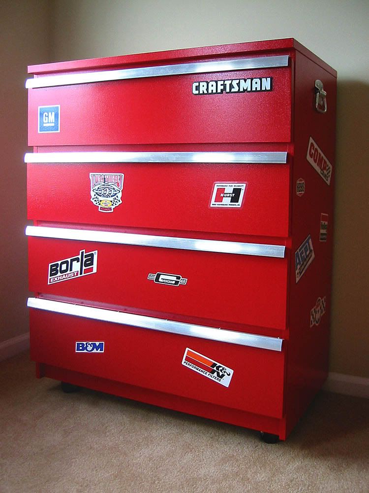 ... some red paint, aluminum stair tread trim, handles, wheels, stickers and a Craftsman emblem.. and PRESTO! The coolest dresser that Daddy made just for him! Now my (almost two years old) son's "big boy room" will have a nifty dresser to go along with the whole racing theme I'm doing in it. He needs to vacate his nursery when the new baby comes in July. I'll post more pics when it's all completed. BEFORE: http://img.photobucket.com/albums/v4...E099435_S4.jpg AFTER: http://img.photobucket.com/albums/v4...Picture020.jpg |