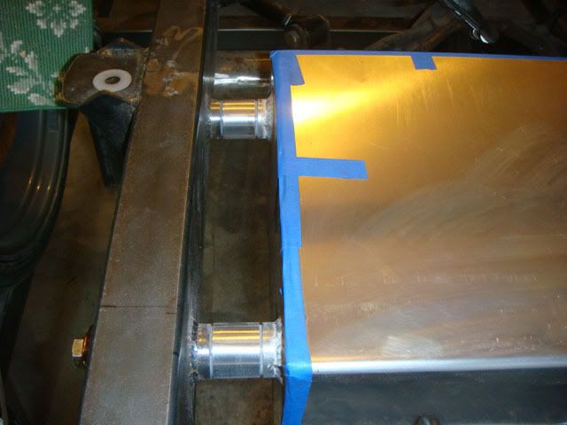 FINALLY PROGRESS!!!!!! I got my gas tank bent, welded and installed. Well almost I still have to weld on the top piece but i have to wait for parts to finish it completely. I went a little different on the install. Instead of just bending some alluminum and making an "L" bracket i decided to take 1 3/8 solid round steel, alluminum and make my mounting pieces from that. The steel piece is welded to the frame and then the alluminum piece on the end is welded to the tank. It has been tapped and helicoil's were installed to give a little extra strength but I didn't drill all the way through. So it is still sealed from the inside of the tank. I put nylon washers inbetween because after everything is powdercoated I didn't want to chip anything getting it installed and since i machined some spacers it makes it really easy to install. Let me know what you think. I wanted to be different but still have it clean looking.