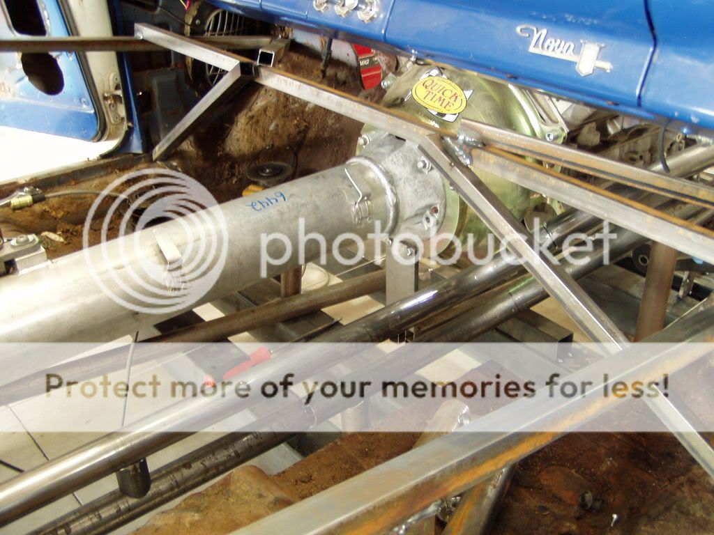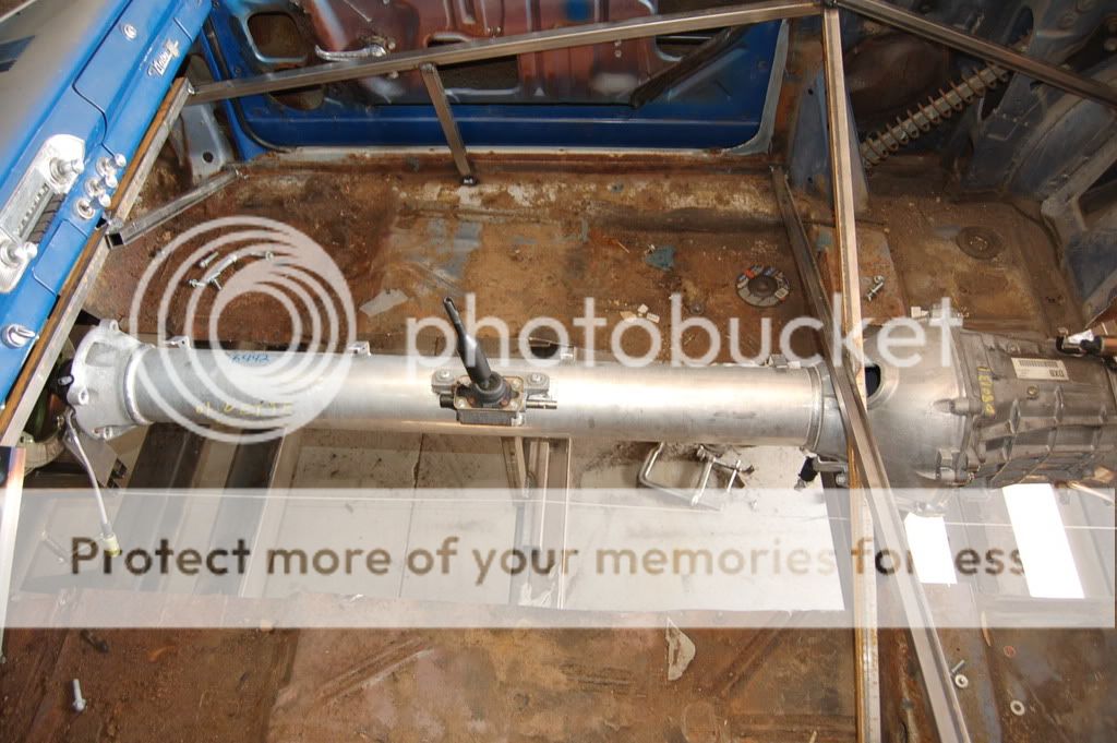The torque-tube had to be lengthened to fit the car. IRONWORKS cut the tube and mated the forward section (with the shifter) the the new Quicktime bellhousing. From there it was easy to (temporarily) add a section of aluminum tubing: