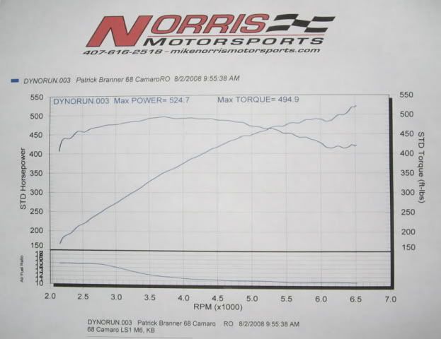 The motor is a basic '00 LS1 with about 20k miles on it...Mike helped me pick the cam and size the injectors but the internals are stock. I was hoping for HP#s in the high 400s. I want to be able pound on it and not have to worry to much about it. So we stayed with a fairly conservative tune--not too aggressive on the timing and not running real lean. It pulled 525hp and 495tq to the wheels!! Needless to say I am very happy with Mike's recommendations on the cam and tuning...and oh yeah REAL happy with the Kenne Bell SC. There is dip in the upper RPM range that we are attributing to belt slip or wheel spin. I personally think that wheel spin sounds more impressive.... http://i71.photobucket.com/albums/i1...ling/Dyno1.jpg |