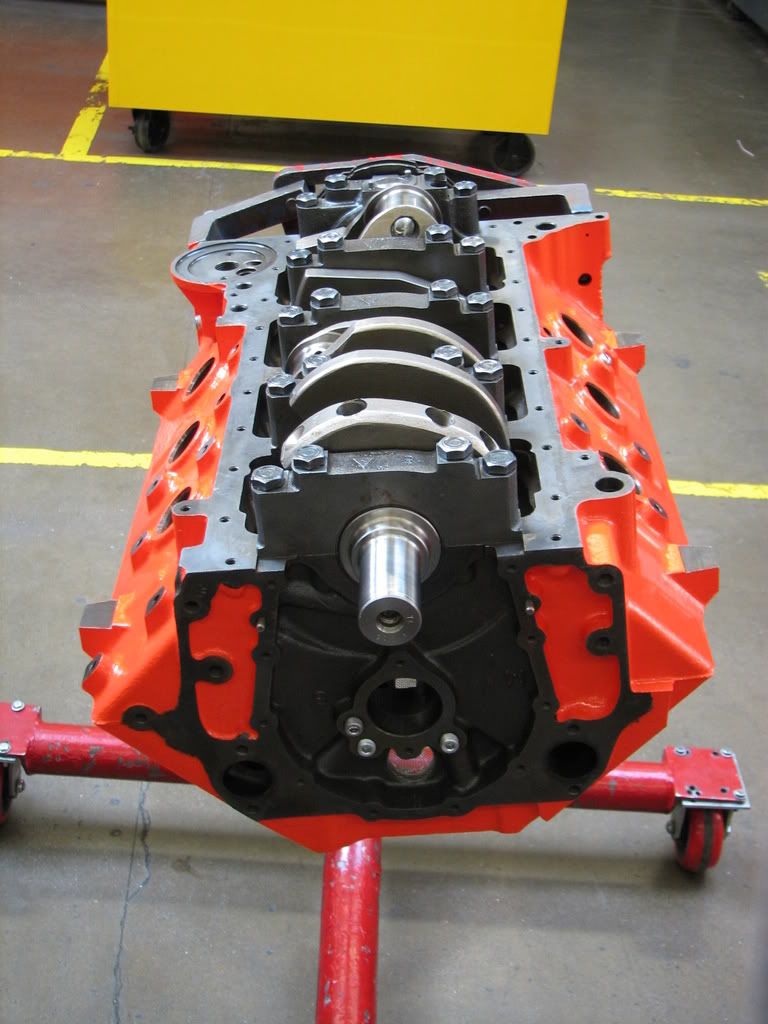 http://i328.photobucket.com/albums/l...dEngine008.jpg Originally the plan was just to build an engine for the car, but that snowballed (more about that later). So I started building a big block to drop in the car. It is a 454 GenV block I found at a junkyard (took 4 tries to get one without cracks in it). It is bored 030 over with a stroker crank making it 489ci (8.0L). So starting on the engine blue print, it is magna-fluxed, sonic tested. Mains, cylinder bores and deck are checked for straightness to get a baseline (pretty good but some machining is in order to make it perfect): http://i328.photobucket.com/albums/l...Engine001c.jpg All the machining is done by me in my engine machining class (except boring and honing they didn't have that machine at the time). Nice fresh block (with Por-15 engine paint on it; I just love this paint, you can hammer it and pour brake clean on it, doesn't phase it): http://i328.photobucket.com/albums/l...Engine001z.jpg Custom grinding was done on the top of the block for increased oil return and a screen kit is installed (case I grenade a valve it will save my bottom end): http://i328.photobucket.com/albums/l.../Engine002.jpg http://i328.photobucket.com/albums/l.../Engine003.jpg |