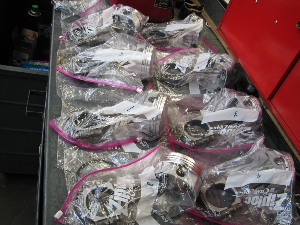 Pistons, rods and pins are all weighed and measured. One Piston was a bit out of spec but JE in Huntington Beach swapped it right out for me with a smile, even giving me one that allowed me to get my piston to cylinder wall clearances all within .0001 of each other.
