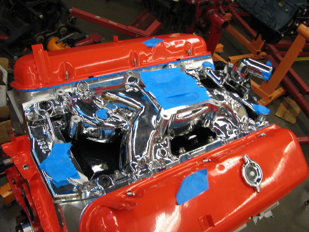 http://i328.photobucket.com/albums/l.../Engine023.jpg Verifying timing: http://i328.photobucket.com/albums/l.../Engine024.jpg Intake is port matched to the heads and goes on. Full roller rockers (Comp Cams) with 1.7:1 ratio. Edelbrock RPM Air gap: http://i328.photobucket.com/albums/l.../Engine026.jpg Valve and timing covers go on (Trans-dapt powder coated valve covers and GM stock timing cover for a GenV motor painted with left over Por-15): http://i328.photobucket.com/albums/l.../Engine027.jpg Valve covers are crappy and leak and replaced later but the intake sure looks nice (durashine finish): http://i328.photobucket.com/albums/l.../Engine028.jpg |