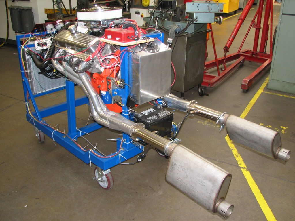 http://i328.photobucket.com/albums/l.../Engine036.jpg http://i328.photobucket.com/albums/l.../Engine037.jpg Fast Air/Fuel meter and dual wideband O2 sensors are installed, along with Pypes Race-Pro mufflers (went with their 3” stainless exhaust kit as well): http://i328.photobucket.com/albums/l.../Engine042.jpg More engine buildup pics here: http://s328.photobucket.com/albums/l...oweter/Engine/ General Stats for the engine Engine Type Big Block Chevy displacing 489ci / 8.0L (4.280 bore x 4.250 stroke) Block 454 Big Block Chevy GenV standard deck Compression Ratio 9.8:1 Oiling Moroso 6 quart oil pan Moroso high volume oil pump Moroso windage tray Custom machining done to top of block to increase oil return Rotating Assembly Eagle Rotating Assembly, Eagle cast crank, Forged SRP Pistons, Eagle I-Beam Rods, Perfect Circle Moly Rings, Clevite Tri-Armor Bearings Cylinder Heads Brodix Race-Rite Oval Port 270cc intake runner, 119cc Combustion chambers. Race valve job, Mini-ported, chambers matched and polished. Camshaft Comp Cams "Thumpr" roller cam 227/241 @.050 547/530 lift 107deg lobe separation. Roller timing chain Valvetrain 2.250 inch intake / 1.880 exhaust valves 5/16" Comp Cams magnum push rods dual valve springs Induction Edelbrock RPM Air Gap manifold, Holly Street Avenger 770cfm, Aeromotive Street Rod electric fuel pump Ignition MSD 6AL box and Distributor with MSD 8.8 spark plug wires Exhaust Hooker ceramic coated headers 2 in primaries, 3.5 in collector. Pypes 3" stainless exhaust system with Race-pro mufflers Fastners ARP Gaskets Fel-Pro Cooling Ron Davis Double pass radiator with integrated coolant recovery tank, dual 13" spal fans and controller, Stewart Components Stage 2 high flow water pump, Robert Shaw thermostat, Earl's transmission cooler. Misc Tilton Super Starter, March Performance V-Belt system. Billet Specialties Valve covers, wire holders and breathers. Moroso battery relocation kit. Por-15 engine paint. Should be about 600hp and 600ft-lbs of torque at peak at the flywheel and about 500ft-lbs off idle! Special thanks to my school and instructor(s) for teaching me and letting me work on my car in the shop. Ready to put in the car now. But wait all the brakes and suspension stuff will be easier to work on while the motor is out… |