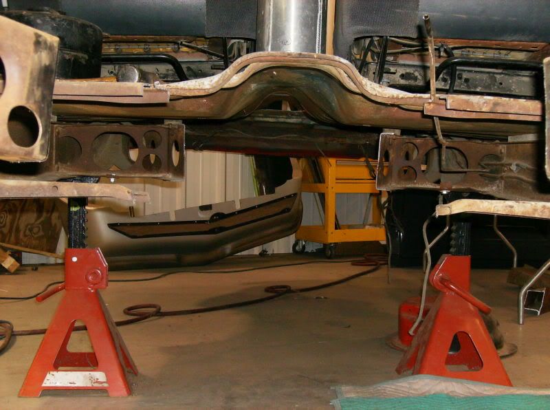So far I've removed the front & rear suspension X member mounts along with the center part of the X member. My intention is to install some fab'd C channel to run on each side parallel to the frame back into the remaining X member. I'll be using this as the side mounting point for my front 4 link setup, driveshaft loop, trans mount & possibly an addt'l brace for strenght. I also scored a Currie built 9" third member with 4:11 gears & a detriot locker. So...... as soon as I get the "C" channel I'm back in biz & moving forward. http://i182.photobucket.com/albums/x...icture1433.jpg http://i182.photobucket.com/albums/x...icture1429.jpg http://i182.photobucket.com/albums/x...icture1430.jpg http://i182.photobucket.com/albums/x...icture1431.jpg Ratty 46 |