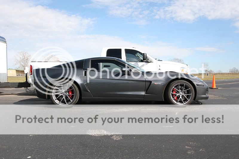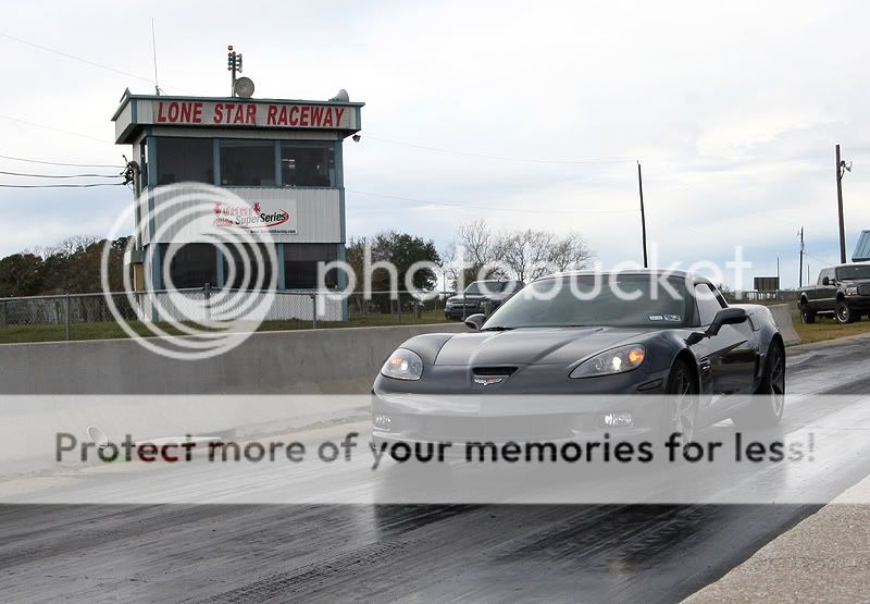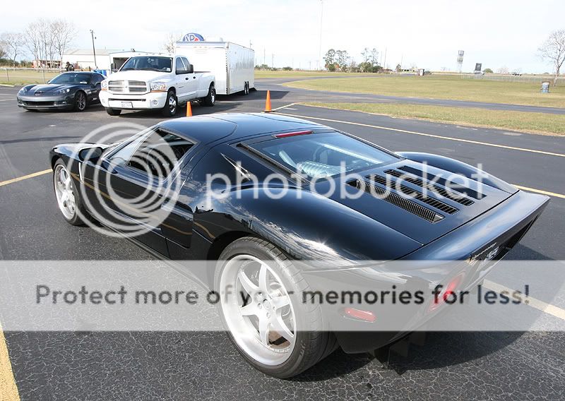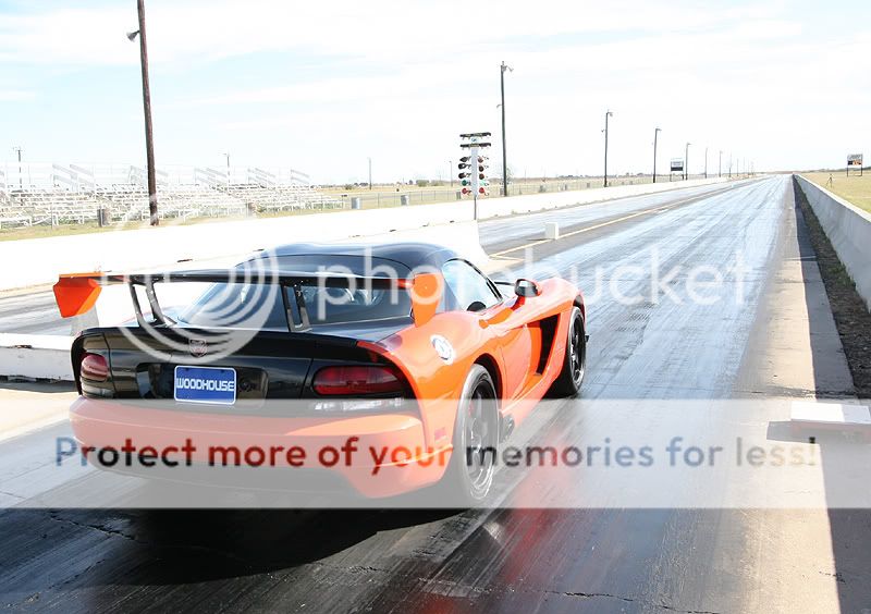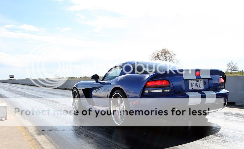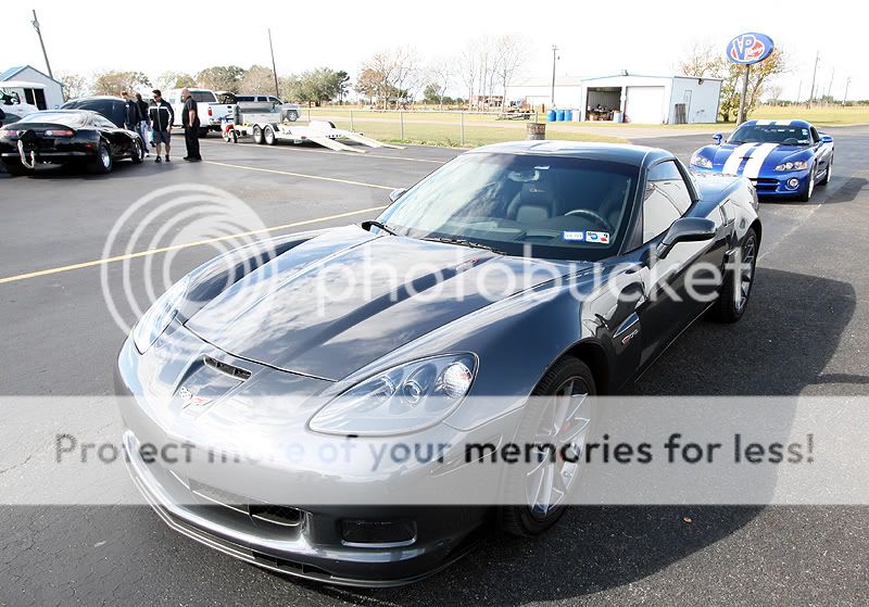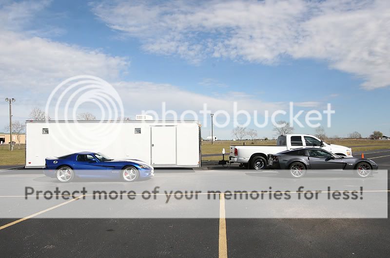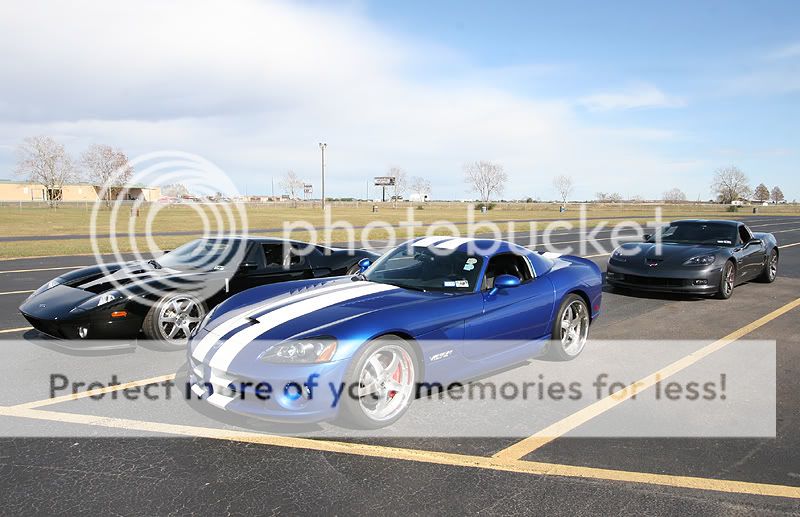 Here is some info about the cars I brought: 2006 Viper SRT-10 coupe - 9,600 miles Stock engine, stock exhaust manifolds with cats Custom catback Stock tuning with Split Second piggyback module Paxton Supercharger with original pulley - 10 psi Eibach lowering springs, OEM shocks 20" Nitto Invo street tires on the back 675 rwhp and 3,750 lbs raceweight 2009 Corvette Z06 - 1,150 miles 100% stock, as-delivered from the dealership. 19" stock Goodyear run-flat tires on the back est 440 rwhp and 3,350 lbs raceweight Both cars are completely different as far as the driving experience goes. The Viper is more brutal, and it has a stiffer clutch with a higher engagement point. Shifter in the Viper has slightly more travel, it takes a little more effort than the Z06. Steering at high speeds seem more stable in the Viper, as the steering feedback is stiffer. Shift points are only 6,000 in this car, which is the factory redline. You cross the finish line about midway through 4th gear, just before it starts to pull very hard. It could use a 3.55 gear for drag racing, instead of the factory 3.08 gearing. This Paxton needs rpm to see real boost, which doesn't really become evident until midway through 3rd gear. It really takes off and you can feel the acceleration jump around 4500 rpm thru 6000. With the 20-inch wheel combo I have on the car, traction is a huge challenge to maintain. I made a couple passes where the traction would disappear going into 3rd gear. Best results came from holding the rpm at ~2300 rpm off the line and slipping the clutch out and rolling into the throttle enough to avoid wheel hop. Once those wheels begin hopping, there is no recovery from it and you must abort the pass. If you manage to get the car off the line smoothly, a short-shift at 5,000 rpm into 2nd keeps the tires from wheel hopping in 2nd gear. No powershifts, or guaranteed wheelhop results. Basically, baby the car until mid-2nd gear and then just keep it straight while the tires haze a bit. Hold on for 3rd and 4th, you can powershift those two. Best passes for the Viper: 1/4 mile 11.22 @ 135.2 mph (2.15 60') 1/8 mile 7.56 @ 105.1 mph (2.07 60') The 2009 Z06 was a much easier car to drive, whether that was due to it having less power or maybe just better tires. The first few passes, I eased into the throttle coming off the line, in order to avoid dreaded wheel hop. The car never unloaded or had any wheel hop, so I get a little more aggressive coming off the line. The TR6060 transmission feels very precise, but it needs to be warmed up a bit before it shifts notch-free. I've found it useful to always do the 1-2-1 shift just before entering the staging beams, this gets rid of the 1-2 notchy feel during the run about to happen. Suspension on the Z06 feels softer than the Viper, you can definitely feel the weight transfer off the line, which makes it easier to gauge your throttle vs traction. I was able to shift the car at redline (7000 rpm) on the 1-2 without much fuss from the tires. Just a simple chirp and they gripped well. The 3rd and 4th gears were easy to powershift. These cars really feel impressive in 3rd-4th for a stock car, you can tell they are moving pretty good. They aren't geared very well at all for drag racing however, you can either tap the rev limiter in 3rd at the finish line, or shift into 4th as you enter the trap. I saw a little better mph staying in 3rd, but better ET going into 4th. These cars would rock with a 3.73 gear to utilize 4th. Best passes for the Z06 1/4 mile = 11.55 @ 124.9 mph (2.07 60 ft) 1/8 mile = 7.60 @ 97.5 mph (1.94 60 ft) Other cars that were running today included a new orange 2009 ACR Viper that had ported heads, cam, and exhaust, putting down 650 rwhp. It was also traction limited, those Michelin tires seemed to spin pretty badly. With a couple lifts due to traction, it eventually went 11.7 @ 129 mph. The black Toyota Supra belongs to S.W. and he was trying to get the car into the 7-second zone for the first time. The car has gone 8.04 @ 185 mph previously, so they removed some raceweight and installed an electric fan for today's track rental. Unfortunately, the car could never hook very well today, so no new records were achieved. That car looks very violent going down the track, it is still a 6-speed manual! Nice driving S.W., bet it is a monster to keep pointed in the right direction. The black Ford GT didn't make any passes, but I couldn't resist taking some photos of it. Thanks again for the invite! Nice photos Dennis, I think you've found your new hobby. Tony http://i466.photobucket.com/albums/r...ck/track01.jpg http://i466.photobucket.com/albums/r...ck/track04.jpg http://i466.photobucket.com/albums/r...ck/track02.jpg http://i466.photobucket.com/albums/r...ck/track03.jpg http://i466.photobucket.com/albums/r...ck/track05.jpg more pics... |