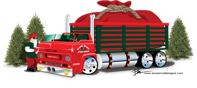 Here's my post for this month. I know the Beach Boys say that Santa cruises around town in a Deuce coupe, but I heard the sleigh just doesn't have the flair it used to for deliveries. Along the way Santa picked up a late 60's-early 70's GMC Tilt cab stake bed beater they were just using to haul junk around the workshop. As a present to Santa, early this year Rudy and the boys chopped the roof off for that open air sleigh ride feel, shaved the door handles, added air bags to make it easy for the old guy to get in and out, 18" Baer brakes, low pro tires on Christmas Ornament style billet 30's, twin 500 gallon tanks, 4 jigawatt fog lamps, a quad turbo (twin stacked) mega inch stroked diesel laying down 4,562 deer power and over 36,000 lbs of torque (all coming in by 1800 rpms), and most importantly a hot chocolate dispenser. Not shown here is the jet powered with additional warp drive and worm hole GPS equipped cargo plane that transports the truck from country to country. So now instead of hoofs on the roofs, the kiddies just need to look on the street for the clouds of black smoke, a whine like a 747, and a deafening noise that sounds like a really big motor with marbles in the cilynders.