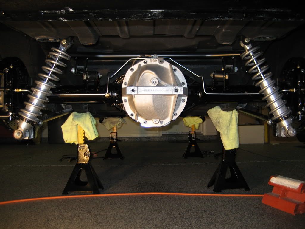 I have the Moser built 9" with DSEs quadralink setup. There is a panhard bar, coilovers, and a big sheetmetal center section to the axle. The problem is that there are no holes or brackets to mount brake lines too. I'm being a little timid about drilling, screwing, welding brackets to the nicely powdercoated axle housing. Does anyone have a picture of how their brake lines run from caliper to caliper on one of these setups? My setup is Corvette rear calipers mounted onto the previously mentioned axle. And thats about it right now. I have some flex lines for the calipers, but I probably don't really need them. Nothing moves around back there. Or am I missing something here? |