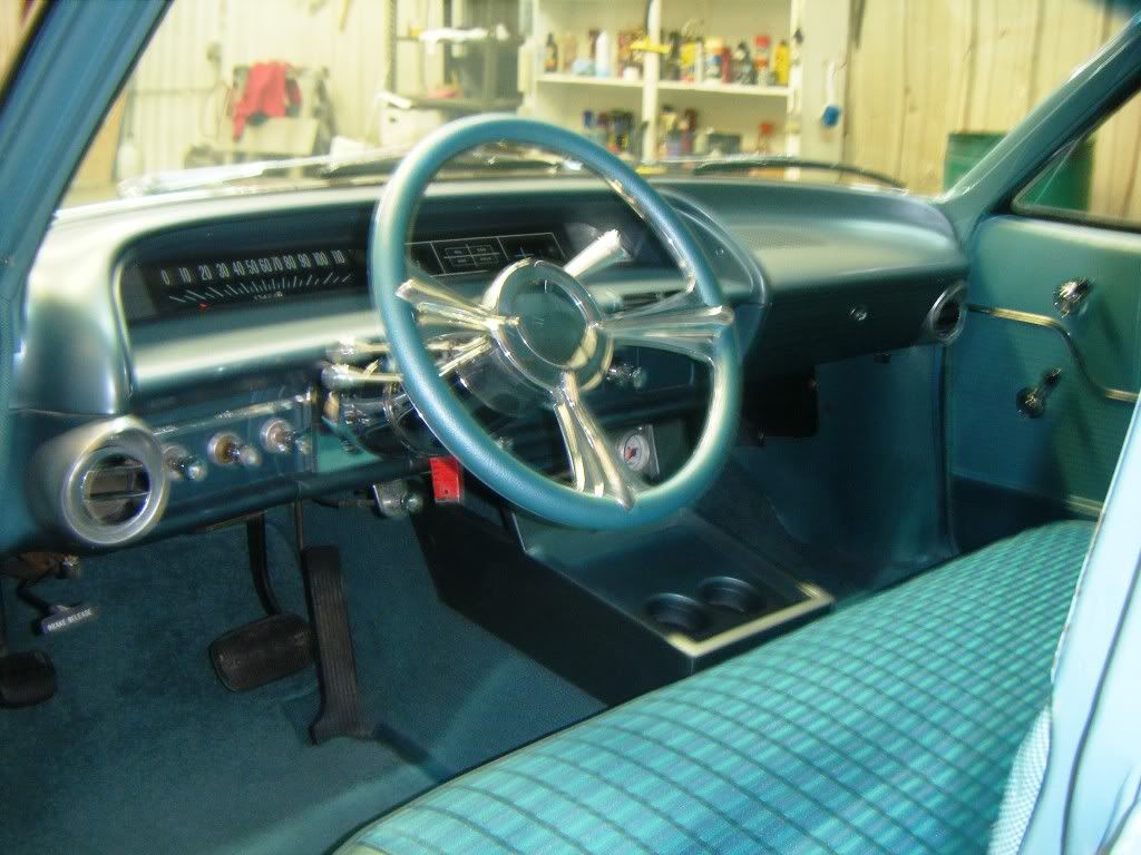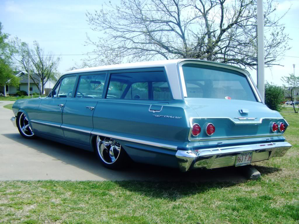 The old car http://i149.photobucket.com/albums/s42/sick65/Car1.jpg Well, this last weekend I found the replacement. It's not a muscle car or pro-touring, but I love it. This time I wanted something I could drive around and enjoy. It's a 63 Belair Wagon with 53K acutal miles. 327, powerglide, PS, PB, and factory air that works great, air ride technologies, 18's and 20's. It still has the original spare tire and jack mounted in the back. I will get some better pics later this week http://i149.photobucket.com/albums/s...63Wagon012.jpg http://i149.photobucket.com/albums/s...63Wagon009.jpg http://i149.photobucket.com/albums/s...onInterior.jpg http://i149.photobucket.com/albums/s...nInterior2.jpg |