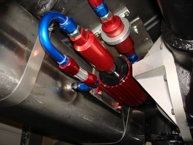 http://i168.photobucket.com/albums/u...Picture073.jpgThe small piece feeding the pump is #10 into a 100micron/10 micron out and #10 all the way to the "Y" under the hood then #6 coming out of the "Y" feeding the rails and # 6 going into the regulator. The return coming out of the regulator is #6 for 30 inches(just behind the upper control arm) then increases to #8 braided line all the way back to the tank. A-1000 pump.