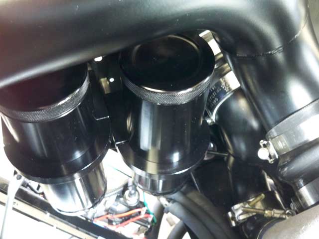 Thanks to Mike for sending me a pair off his first batch of black anodized ps and radiator overflow reservoirs. I have hydroboost on my car and the integral reservoir didn't have enough volume to work well; to get enough fluid in the reservoir to stop groaning it would puke some out of the cap when hot. I then went to a remote reservoir AFCO can, but with the two bypass lines feeding into it the fluid would bounce off the cap at any level and leak from the gasket.