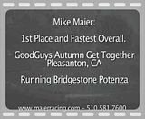 Mike took First in his category and Over all Fastest time of the weekend. http://i174.photobucket.com/albums/w...r_GG_Autox.jpg some pix http://i174.photobucket.com/albums/w...GX_1114_01.jpg http://i174.photobucket.com/albums/w...GX_1114_02.jpg http://i174.photobucket.com/albums/w...GX_1114_03.jpg Some shots of Mary Possi, No video though :( http://i174.photobucket.com/albums/w...GX_1114_04.jpg http://i174.photobucket.com/albums/w...GX_1114_05.jpg |