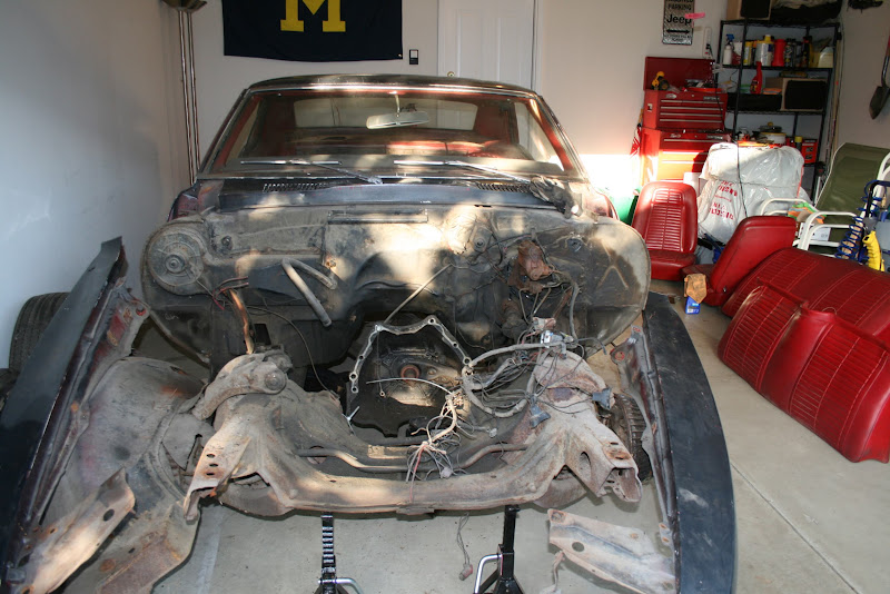 I've nearly finished taking the car apart. Everything is off the firewall, front subframe is off, and interior is taken apart. I need to take out the passenger rear glass, take off the doors, and pull a few more interior bits out. Then, it's just the rear end and glass.