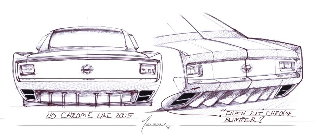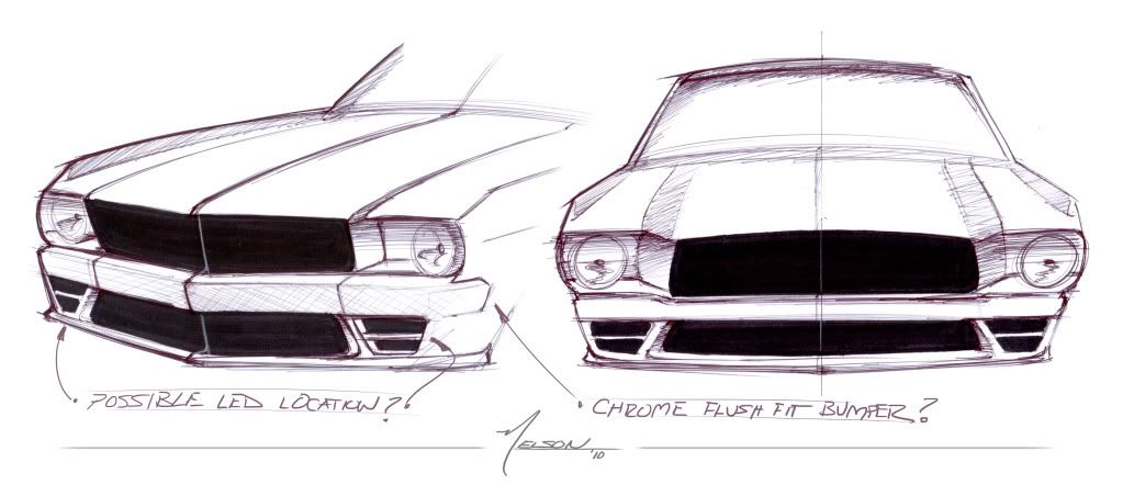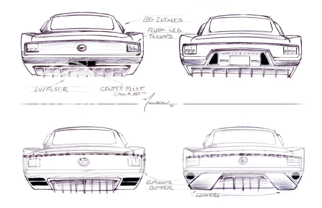 I recently got motivated to finish a project that has been almost ten years in the making. All the puzzle peices are finally starting to fall into place and the project is now more feasable. I have contacted Nelson Michael to make me some preliminary sketches of a new mustang body based on the iconic 66 fastback. Your critique and constructive criticism is welcome, but it will not be for everyone. It is always tough to keep the classic lines while updating the feel. It needs to be a 66 fastback with some updated touches. that being said, the side and 3/4 views will come when I have paired the front and rear that I like. These designs are simply concepts and can be mixed, matched, or scrapped completely. On a side note it has been a pleasure working with Nelson and I hope anyone with a desire to get sketches and work done will consider him. Take a look and let me know. Louie http://i985.photobucket.com/albums/a...f/Rears_1.jpg? http://i985.photobucket.com/albums/a...rontviews.jpg? |