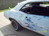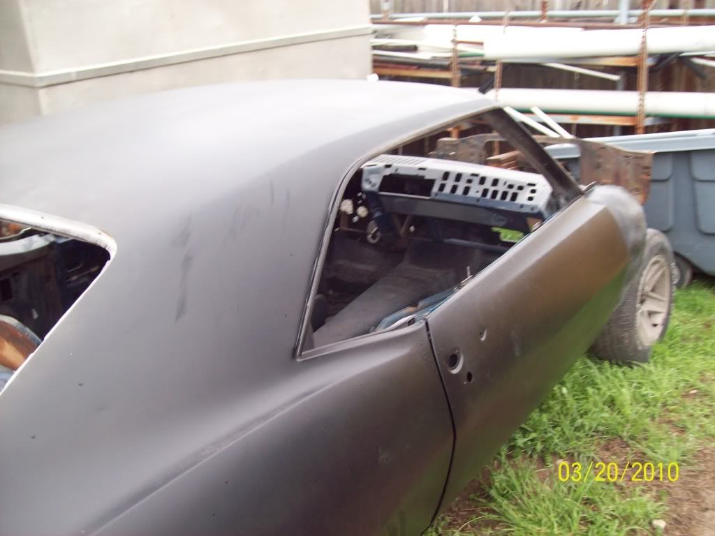 I plan to 4 link the rear and upgrade the front suspension and drop in a ls series engine (not sure of which one yet). the car needs a new lt quater panel and roof thanks to some bad body work. the front frame is rotted however I have one on the way to replace this one. some of the rust was hidden under bondo |