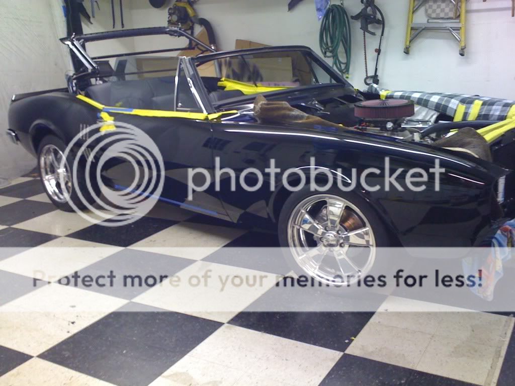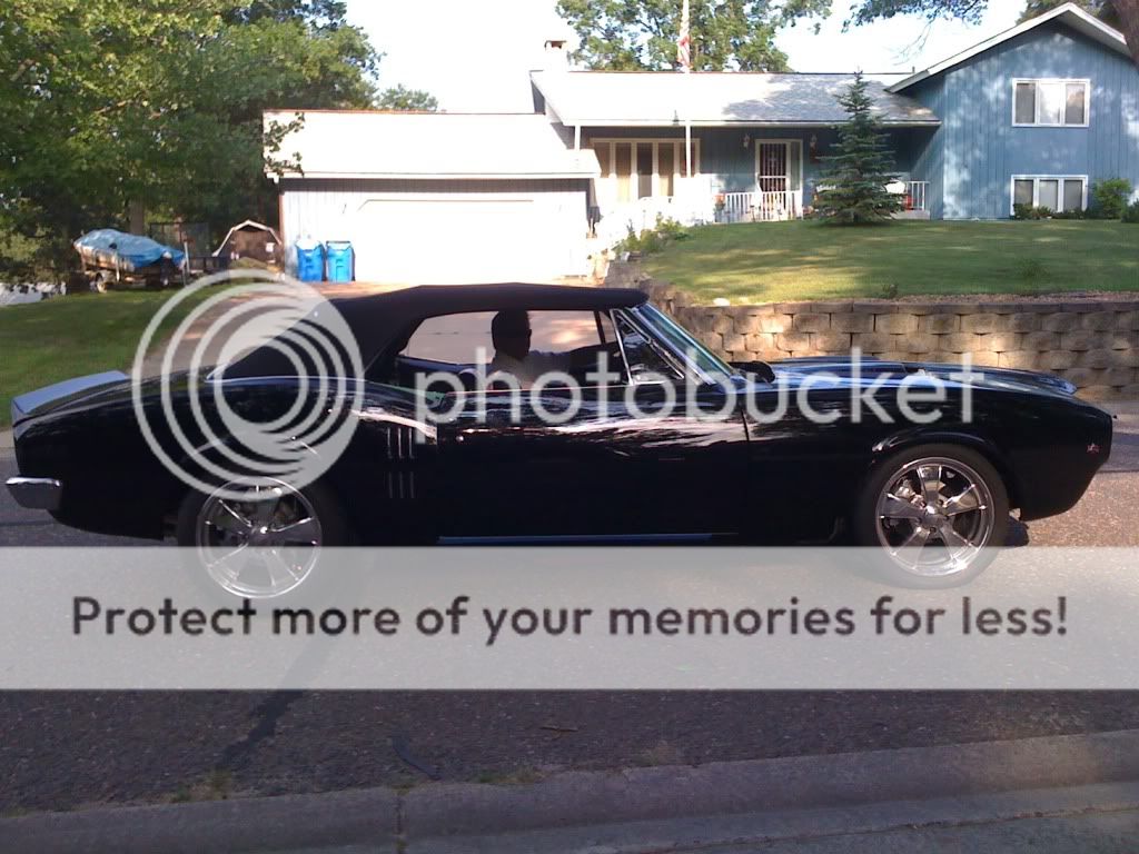 My dad and I have been restoring a 1967 Firebird for the past 5 years. Here are the details and pictures: Project: 1967 Firebird Convertible Factory AC Numbers matching block Under the Hood: Engine (Bulter Performance Parts, Wheeler Racing Machining) 586 HP @6000 RPMs 462 CI 330 cfm ported Butler race heads Port Matched Performer RPM intake Holley 4150 HP Forged rotating assembly 4 Bolt Mains Canton Oil Pan Dougs 1 7/8" to 3 1/2 headers 10.25 to 1 Compression MSD ignition (Hidden in the glove box) Billet Specialties Serpentine System Cooling- Norther Radiator - Updating to a Ron Davis Dual Spal fans Drive Train: Tremec TKO 600 Center Force Dual Friction Clutch GM 12 Bolt Rear End Hotchkis 2 inch drop Front, 3 inch rear QA1 Shocks 18 inch Intro V-Rod Rims Bfgoodrich KDW G-Force Tires Rear - 255/40/18 Front - 225/40/18 Paint and Body: Father and son first paint job PPG Single stage with clear coat finish Weld in frame connectors Shaved rear spoiler to sit low Interior: 1998 Firebird front seats re-covered in leather by Yellow Dog Leather covered factory rear seat Vintage Air Dynamat floors Everything else new http://i905.photobucket.com/albums/a...0/P5080846.jpg http://i905.photobucket.com/albums/a...0/P5080845.jpg http://i905.photobucket.com/albums/a...0/P5080847.jpg http://i905.photobucket.com/albums/a...0/P5080847.jpg http://i905.photobucket.com/albums/a...0/P3101296.jpg http://i905.photobucket.com/albums/a...0/IMG_0061.jpg http://i905.photobucket.com/albums/a...0/IMG_0064.jpg http://i905.photobucket.com/albums/a...0/IMG_0063.jpg http://i905.photobucket.com/albums/a...0/IMG_0062.jpg http://i905.photobucket.com/albums/a...0/IMG_0069.jpg http://i905.photobucket.com/albums/a...0/IMG_0103.jpg http://i905.photobucket.com/albums/a...0/IMG_0102.jpg http://i905.photobucket.com/albums/a...0/IMG_0098.jpg http://i905.photobucket.com/albums/a...IMG_0105-1.jpg |