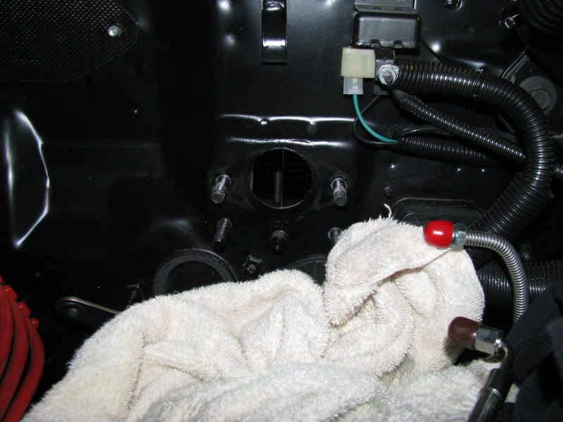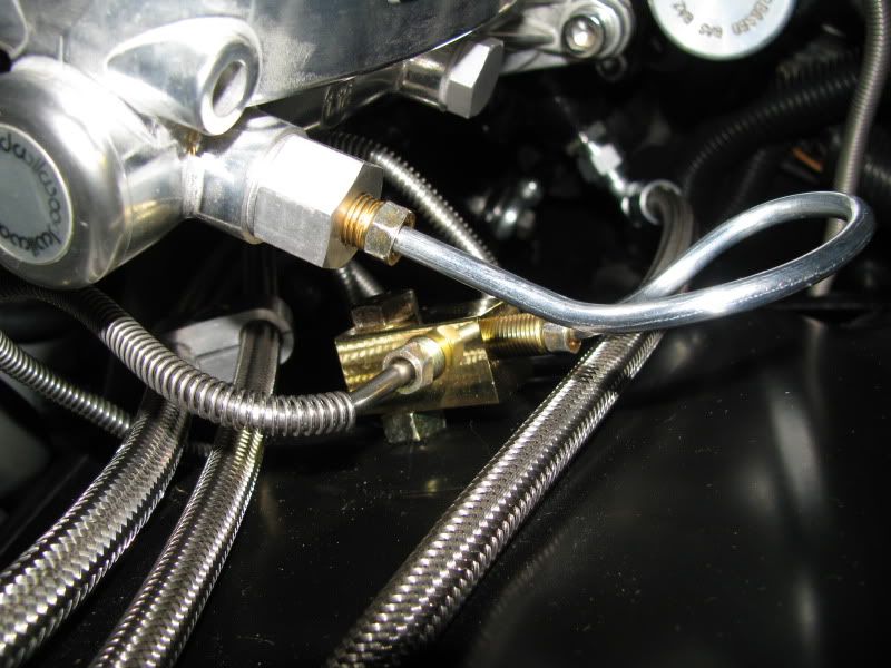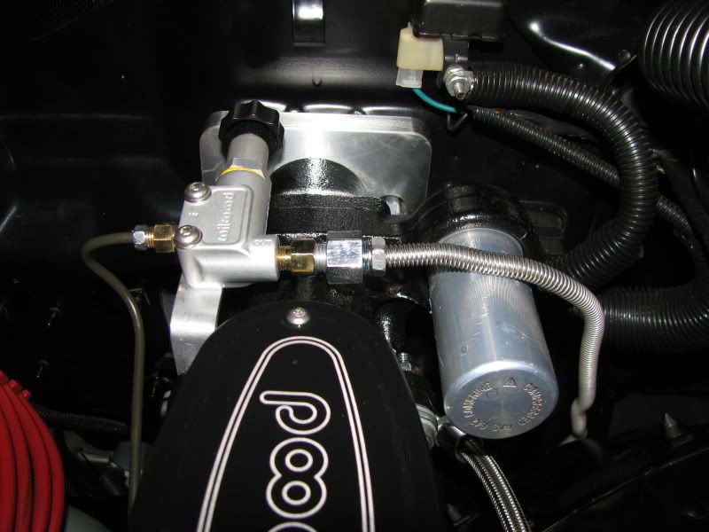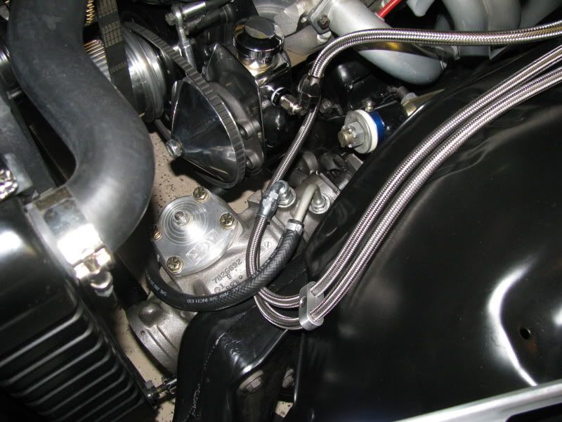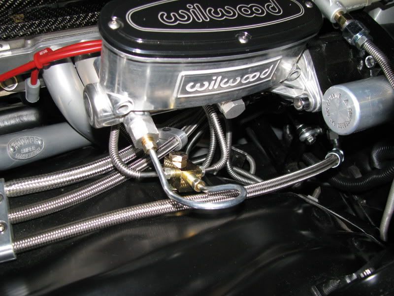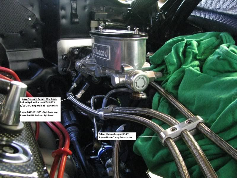 Parts for that mod were ****** Hydraulics part# 8203 (5/16-24 O-ring male to -6AN male), 2-Russell 613161 90* -6AN hose ends, Russell 670850 -6AN Fuel Cell Bulkhead fitting, ****** Hydraulics part# 1451 2pack of 3 Hole Hose Clamp Separators and Russell Stainless Steel braided low pressure hose. http://i145.photobucket.com/albums/r...t/IMG_2947.jpg First drain the PS pump reservoir, remove old PS hoses from pump and steering box http://i145.photobucket.com/albums/r...t/IMG_3031.jpg Then remove old master cylinder brake pedal rod from the brake pedal http://i145.photobucket.com/albums/r...t/IMG_3034.jpg Disconnect the front and rear brake lines and remove the old master cylinder http://i145.photobucket.com/albums/r...t/IMG_3036.jpg I made a new gasket to fit between the new HB unit and the firewall, I used Felpro# 3157 rubber fiber gasket material from NAPA Auto Parts. Then I installed the HB unit. Before installing the Wilwood master cylinder, install the two high pressure lines and the low pressure return line. Installation of these hoses is nearly impossible if you install the master cylinder first (ask me how I know). Remove the preinstalled brass 90* fitting for the low pressure return port from the HB unit, and replace with the THI 5/16"-24 O-ring male to -6AN male fitting on the HB unit. Be sure to torque ONLY to 10 ft. lbs. as the threads for this fitting can strip very easily. Use one wrench to hold this fitting while tightening the Russell part# 613161 90* hose end with another wrench. http://i145.photobucket.com/albums/r...t/IMG_3038.jpg Day 2) I drilled a hole above the fluid line in the PS pump reservoir and installed the Russell #670850 -6AN Fuel Cell bulkhead fitting in the reservoir for the low pressure return line from the HB unit. I stuffed a clean shop rag into the reservoir, spread some grease on the end of the drill bit(metal particles stick to it), and vacuumed real well with the shop vac to make sure no metal particles got into the reservoir. http://i145.photobucket.com/albums/r...t/IMG_3043.jpg Then I cut to proper length, the two high pressure lines coming from the HB unit and installed the Aeroquip fittings and then installed them in their proper locations, and also installed the Russell part# 613161 90* hose end on the other end of the low pressure return line and installed that on the PS reservoir. http://i145.photobucket.com/albums/r...t/IMG_3044.jpg http://i145.photobucket.com/albums/r...t/IMG_3049.jpg http://i145.photobucket.com/albums/r...t/IMG_3047.jpg Next I need to fill the power steering pump with fluid, and bleed the system, checking for any possible leaks. I'll be securing the two hose clamp separators to the inner fender, I need some new hardware for that. I also need to bend some new lines for installation of a proportioning valve and then bleed the brakes. Then a test drive!! |
