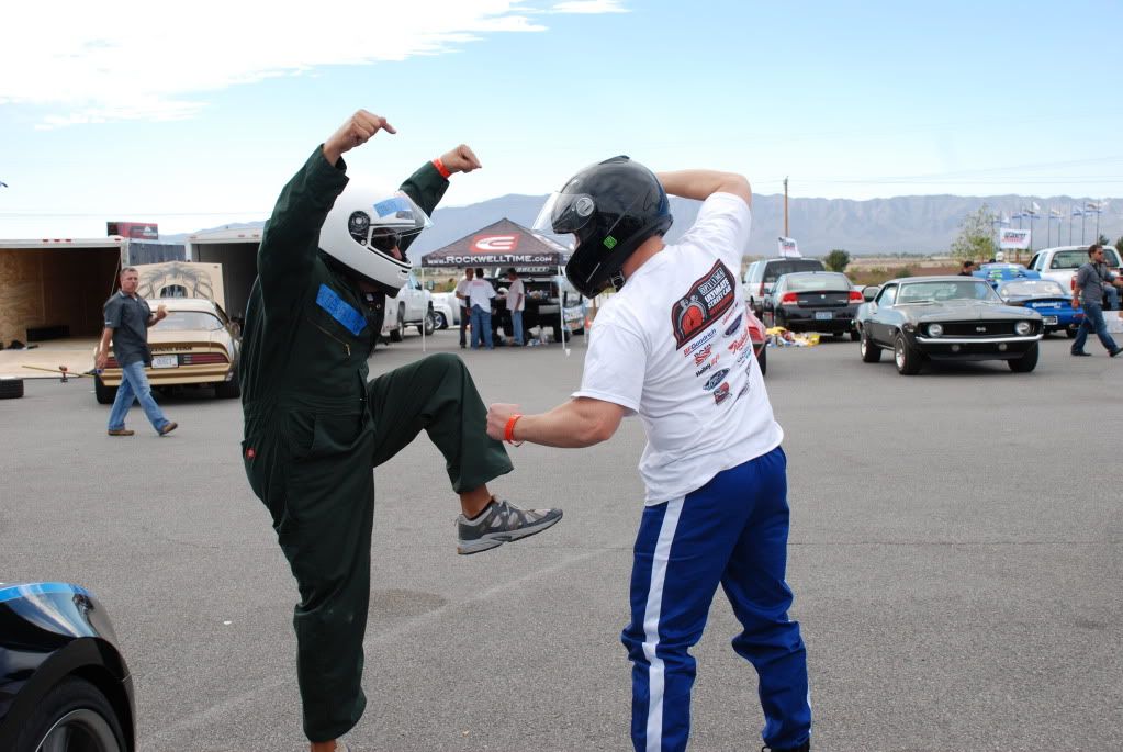 The OUSCI was an outstanding event. The time, organization, thought, and effort put out by the organizers, volunteers, and participants is what makes this event special. Without everyone working together it could not happen, so first and foremost my thanks go out to Optima, FM3, the event sponsors, and especially the volunteers. Greg, Tito, Doug, etc., you guys rock. I left home at 4:30am Monday to head to SEMA. I love to drive during sunrise in the Mojave Desert. It is one of the most beautiful scenes to behold and it's something that I don't like to pass up. Here's the sun just starting to show itself just outside of Barstow. http://img263.imageshack.us/img263/8...wearlymorn.jpg With some spirited driving and averaging something north of what I should have, the car made 23mpg overall on the road trip. After meeting up with Todd (aka Iceman) at his place on Monday we headed toward the Optima Coral at SEMA. Luckily the do-dah-man on Todd's left did not feel the need to start our week of on the wrong foot. http://img263.imageshack.us/img263/7734/toddq.jpg The Coral was as far south as possible in the outdoor parking lots. We shared the same lot with the West Coast Customs truck/display and the DUB group. Since there were about 40 cars in the Coral, some of us started call it the South 40 due to it's remote location. Bill Howell had the best name though, "The DUBS and the Do'ers." The Do'ers did not have as many scantily clad girls as the DUB's did. With us in the lot were a bunch of great cars and trucks, But even more impressive were the people. Tom Farmington brought his wife and kids with him to SEMA, and they are the nicest people you could ever meet. The other Tom, with the oh-so-cool 1934 Ford truck. What a guy, and what a truck! 196MPH in that thing has got to be a religious experience. Bill Howell, Telly, Chris and his wife Lynda, everyone, just great people. I'm glad to be able to say that I made a lot of new friends there. Optima really treated us well. They had the awning out on the trailer so there was some shade, and a security guard was stationed right next to our group at night. We were also given embroidered jackets, duffel bags, and backpacks. Lots of t-shirts and other handouts were also included, including a very generous $250 Ridetech coupon to every competitor that had a Ridetech sticker on the side of their car. http://lateral-g.org/events/sema2010/DSC_0209.JPG Each of the competitors had to do a TV interview. Though I really wanted to, I resisted wearing the janitors flight suit until race day. I tried a couple of one-liners to hopefully increase my chances for four seconds of television glory. Yeah, right. The start of the real events was the Road Rally. It started with a short drive to the Silverton Casino parking lot to take a group picture. While waiting for the photographers to finish each competitor was given an SD card for their camera. Each competitor had to take two pictures at two different Las Vegas landmarks and have the SD card turned in at the Best Western Pahrump by 10:00pm. James Shipka and I teamed up and hit a wedding chapel and the Mirage hotel. Neither of us wanted to brave the Friday night Las Vegas traffic. I was also lucky enough to have Lynda be my navigator during the photo portion of the Rally. She said something about Chris dumping her, but that's another story. After dropping Lynda off at the Silverton, James and I headed to Pahrump. What a great drive. It took about an hour but the weather was perfect, the road great, and very little traffic. After arriving at the hotel we got out of our cars and James expressed the same thought I had, "I love this car." I was lucky enough to share a room with David Pozzi. The Pozzi's, along with their friend Deanna, were nice enough to play musical rooms so that I had a bed to sleep in. I can only hope to be as generous and gracious as they are. I owe them a lot more than just the cost of the room. We hit the hay early knowing a long day awaited us. |