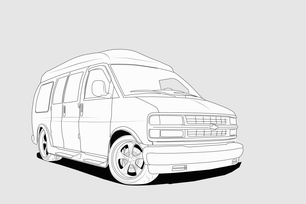 I just purchased a 2001 Chevy Express 1500 w/Cobra conversion package. We had been needing a big family roadtrip machine for a while and this one fit the bill. I plan to pint the van a sollid color, (probably black) upgrade the brakes to something larger, and add some nice rims and tires. Ok so I started out on the line drawing and thought it would be cool to see what a Caddy front clip might look like. Below are the line drawings with stock front end and with a Caddy clip. I will most likely brush both versions out to completion. Have a look.