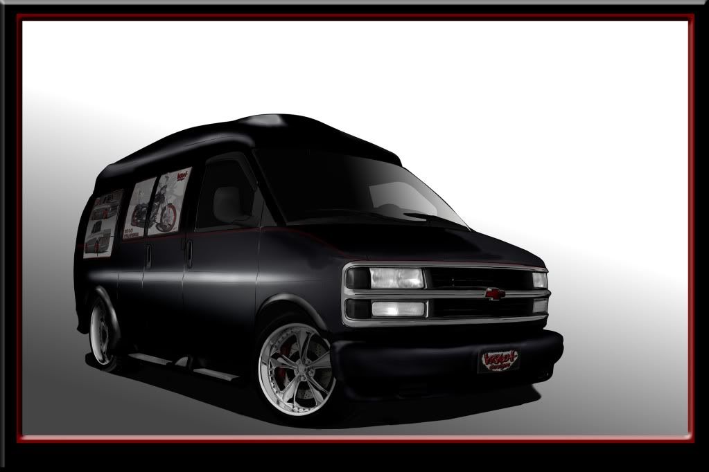 Yeah I digg that Chevy front end, but I look at it and it still dosent loook right, What I have for a bumper is a one piece cover with a seperate air dam, what it needs, is a fulle chrome bumper, tucked and hand shaped, I drew it with 20s but am thinking about doing a diffent sixze, maybe as low 17 with big ass rear meats. The guy I talked to about the one way tint for the rear glass is trying to talk me into wrapping the whole body, I played with it on a copy of this, it kinda looks cool, for a billboard.