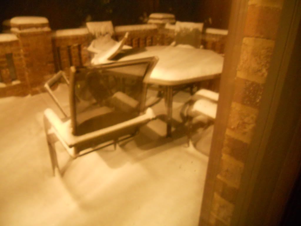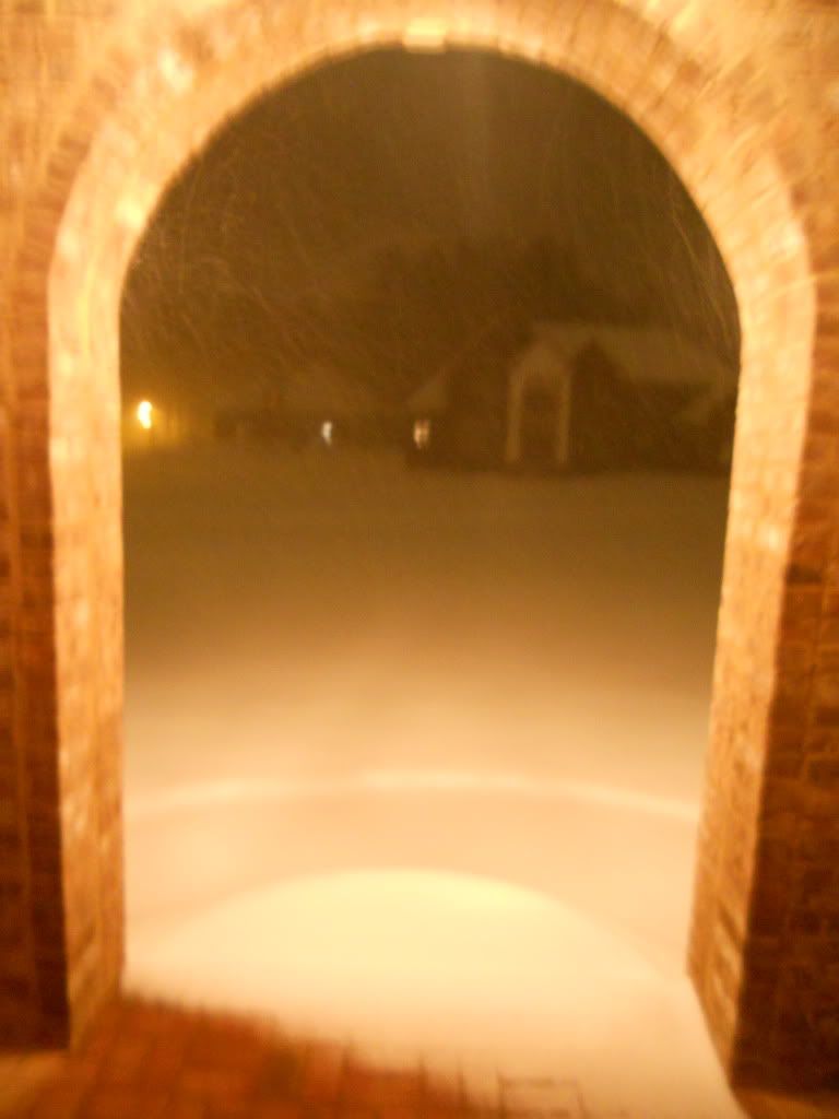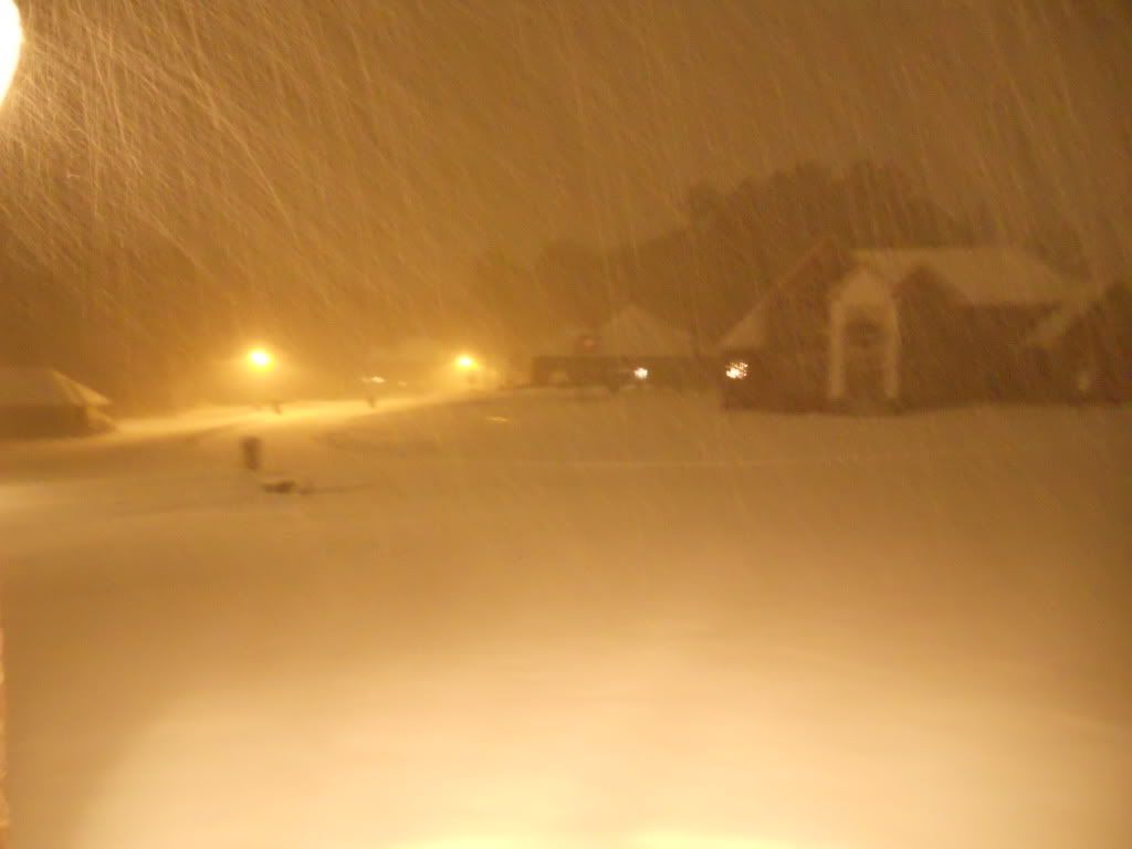 It's snowing here. Thought I would stay up late to see it roll in. The driveway and grass are covered. The street is almost covered. Why can't this be Friday night?