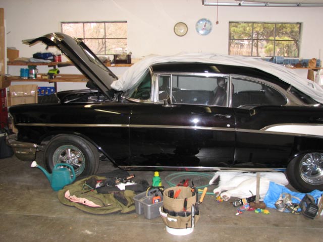 A little (long) history: Dad bought the car in the late 80's at a repo auction. Had been mildly rebuilt, poor quality yellow paint, new grey cloth interior, 327/4-speed. I was 6 or 7 at the time and it was my first experience with old cars. Dad had a black '57 hardtop with a corvette 327 when he was in highschool in the late 60's and his dream was to have another. A couple years after purchasing the '57 a good friend told him he was converting his numbers matching 427 '69 vette to a crate LS-6 454/5-speed combo to do some drag racing. Dad thought that was an intriguing idea and purchased a second LS-6 for his car. They disassembled both cars in his friends shop at the same time but all the focus went into the vette. The vette was built in a year or so and the '57 sat gutted. About that time my parents purchased an older home to remodel. So the '57 was basically forgotten for 8 more years. Fast forward to 1998 (I was 16!): The '57 had been sitting outside in the country in southwest Kansas (My dad's friend had moved on to other hobbies and needed the shop space so dad told him it was okay to stick it behind the shop). Sand had blasted the paint, rats ate out the interior. Finally my mom asked a mechanic friend that did all the work for our farm business if he would get the '57 going for my dad's birthday. They moved everything into his shop. It wasn't even close to running before his birthday, but dad did start getting interested in the car again. By this time the '69 vette had been in the 10's and then converted back to original so all the go-fast goodies from it were available for the '57. The mechanic took several years to get the car built in his off-hours. A '73 firebird subframe was grafted on the front, 9" ford with springs swapped inside the frame was put out back. The crate LS-6 was reassembled with a hot hydraulic roller cam, holly DP850. The richmond 5-speed and mccloud hydraulic clutch from the vette were set to go in but the mechanic was having a fit getting the master cylinder mounted and lined up with the peddle. He talked my dad into putting a TH-400 in instead!! Car was at least running by 2001, and sent to my dad's best friend's collision shop for body work and paint. Both rear quarters and one front, one door skin, and both rockers had to be replaced. Floor was solid! The car was obviously in a wreck and patched back together at some point. In the body shop for 6 months, but it was finally sprayed in a black cherry pearl with pearl white fin insert. I polished all the stainless over a christmas break. The car was sent to the best upholstery business in town (That doesn't say much!:_paranoid ) where '96 mustang fronts and original back seats were covered in burgandy vinyl and black tweed. The '57 was pretty awesome for awhile but we soon started getting all the gremlins. The wiring was a mess (stock harness was modified and added onto), dash lights would blink in a disco-like fashion, electric windshield wiper conversion would come on unexpectedly (most likely grounding issues). One taillight was brighter than the other. Ontop of that, the timing was way off on the LS-6 and it would overheat easily and never start when hot. I was away at college but dad continued messing with the car to get it running correctly. The mechanic that built the motor swore up and down that everything was put together correctly but noone had time to work on the car to verify this. I was busy going to school and building a pro-street '68 chevelle SS clone with the old LS-6 out of the corvette and my dad had other priorities. The '57 just sat in the garage. Since 2002 the '57 was driven probably 2-3 times a year, usually when I was home for the weekend or my dad had a wild hair. As time went on it was driven less and less. Most recently it hadn't been driven more than a block in the last 2 years. No AC, no Heat, rear suspension wasn't set up correctly, timing issues, and THE DANG AUTOMATIC TRANSMISSION totally made my dad disinterested in the old car. I finished school, finished the chevelle, started a career, got married, started a family, sold the chevelle:( to buy a family hauler in the time since the '57 was built. And it never accumulated more than a couple hundred miles on it. Several years ago I suggested that Dad get a pro touring style frame built and a LS/T56 installed to make the car a fun driver. He loved the idea but retirement was much to busy for him to build it himself. And I didn't have the room or time to do it at my house. And now the future for the '57 we call Thumper... I'll post up details on what we are doing and where it is at later. Thanks for reading! |
