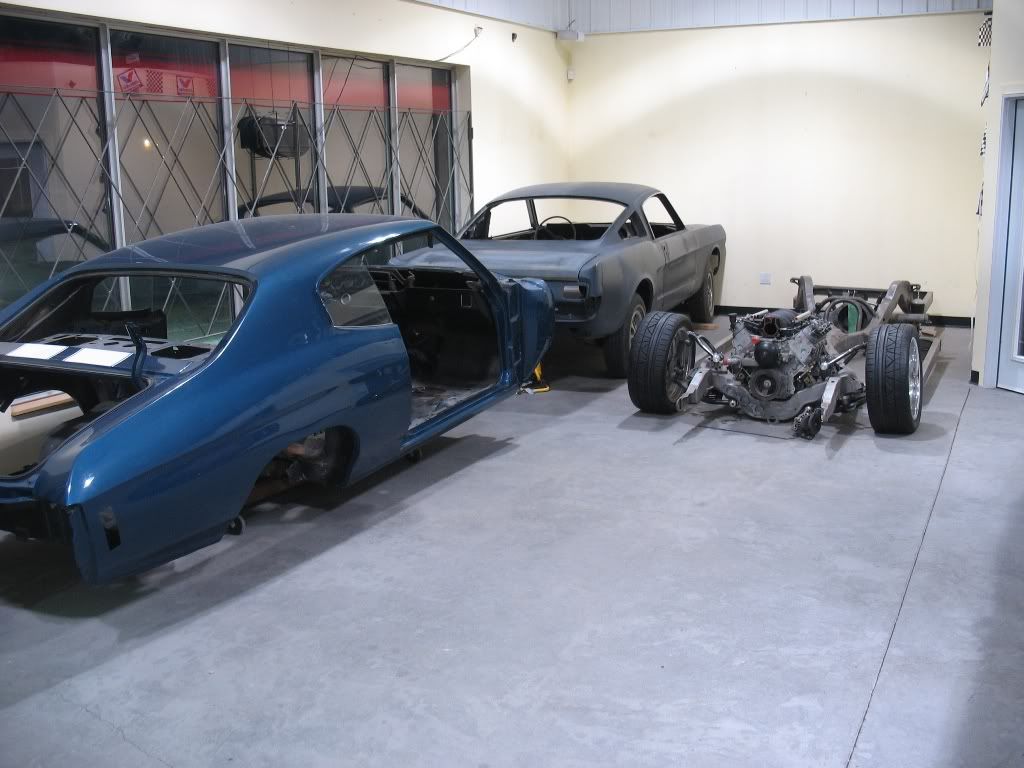 http://i1204.photobucket.com/albums/...s/IMG_3466.jpg Here is another chevelle that is waiting in line, and a 65 Mustang Fastback that we have a 2011 5.0L and custom chassis going under and a ton of custom parts and body mods (our next big one, so watch for a build thread!) And my 64 Pontiac (I did start on the body!!!!!) http://i1204.photobucket.com/albums/...s/IMG_3455.jpg Another 55 Belair that we modified the stock frame and did a LS1 Crate drivetrain, Ricks Tank, Stainless exhaust etc http://i1204.photobucket.com/albums/...s/IMG_3456.jpg |