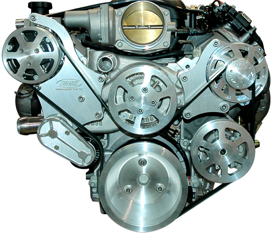 Complete systems include these billet parts: Crank Pulley Water Pump Pulley Power Steering Pulley Alternator Pulley w/Fan A/C Compressor Cover Tensioner Cover A/C compressor Manifold All Necessary Brackets And include these accessories: Powermaster 105 amp 1-wire Alternator Edelbrock Waterpump Sanden A/C Compressor Maval P/S Pump Gates Tensioner Gates 6 Rib Serpentine Belt ATI Damper and Hub (LS only) Small Block Kit http://i842.photobucket.com/albums/z.../sbcCustom.jpg LS Kit http://i842.photobucket.com/albums/z...S107-61M-2.png Big Block Kit http://i842.photobucket.com/albums/z.../bbcCustom.jpg |