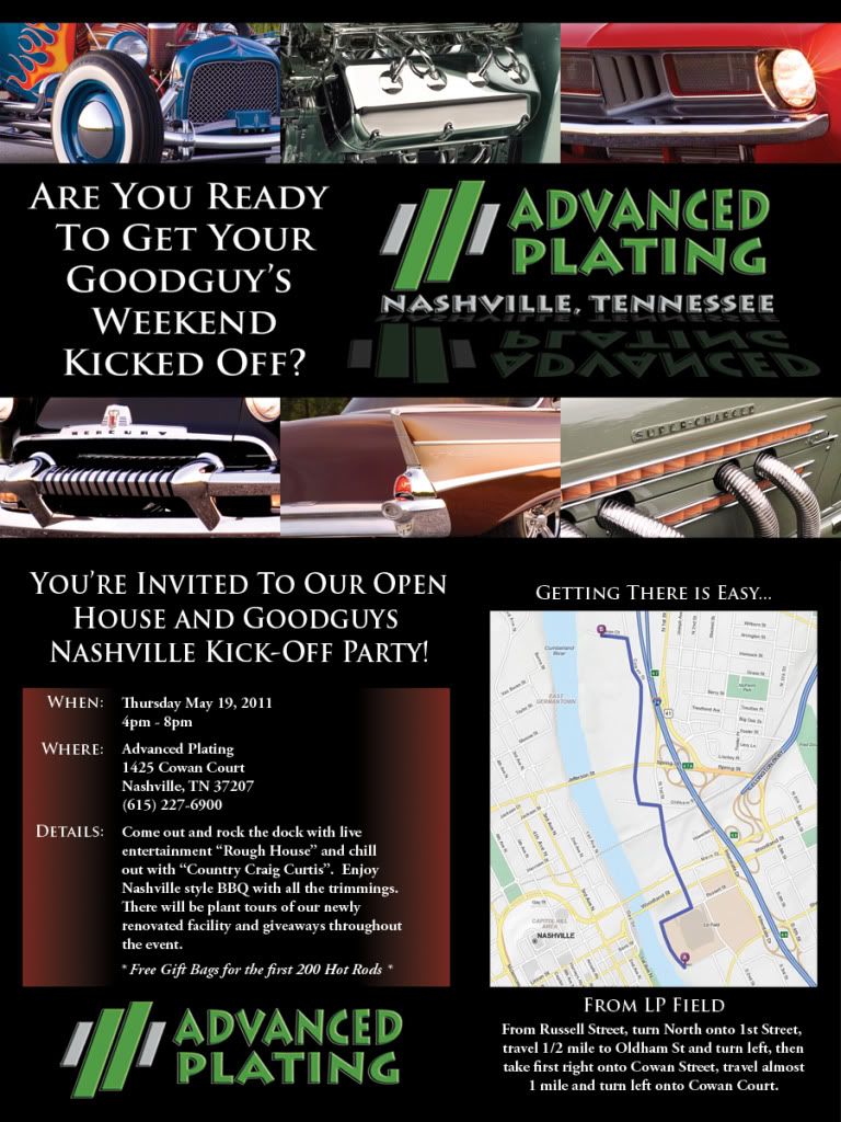 If you are planning on going to Goodguys Nashville next weekend, I would like to invite you all to come to the kick-off party we are throwing at Advanced Plating. It will be Thursday May 18th, from 4-8pm. There will be BBQ for participants, giveaways, live bands, and tours of our totally remodeled facility. See flyer below for additional info. Look forward to seeing everyone there Thanks, Josh http://i255.photobucket.com/albums/h...Invite2011.jpg |