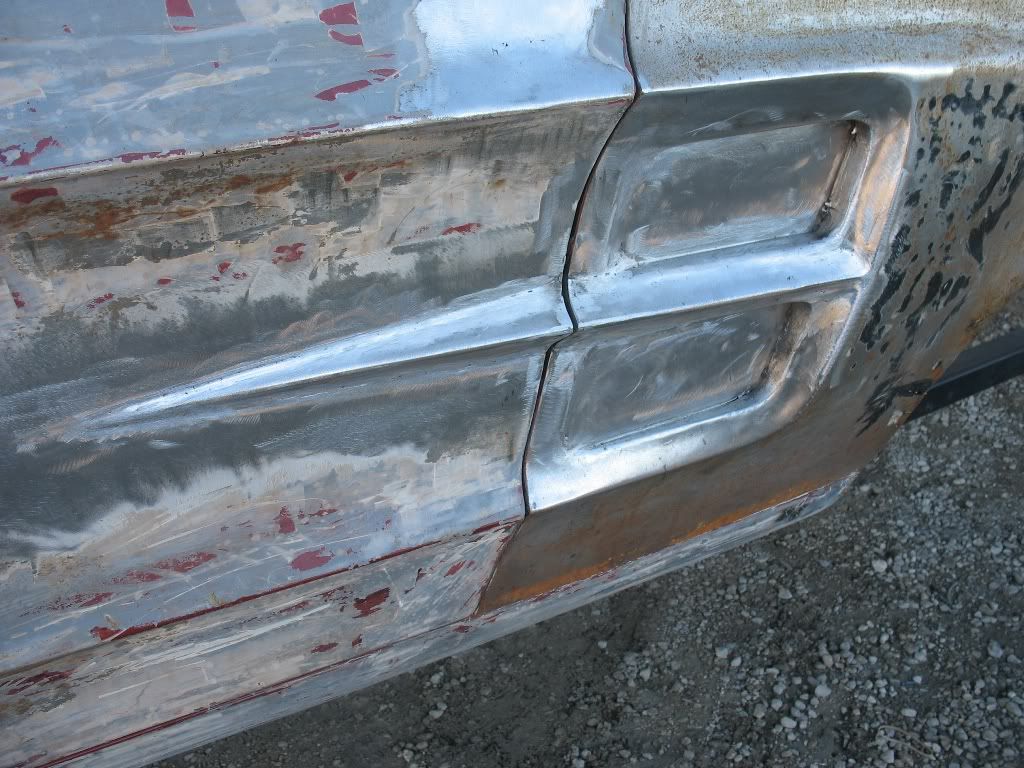 The body came from Florida, and we had to do a fair amount of sheet metal replacement, inlcuding floor patches, drip rails, quarters, wheel lips, firewall, wiper cowl, rear window lip, trunk floors, and quarter extensions. We also made quarter panel end caps to eliminate the pot metal seamed piece.