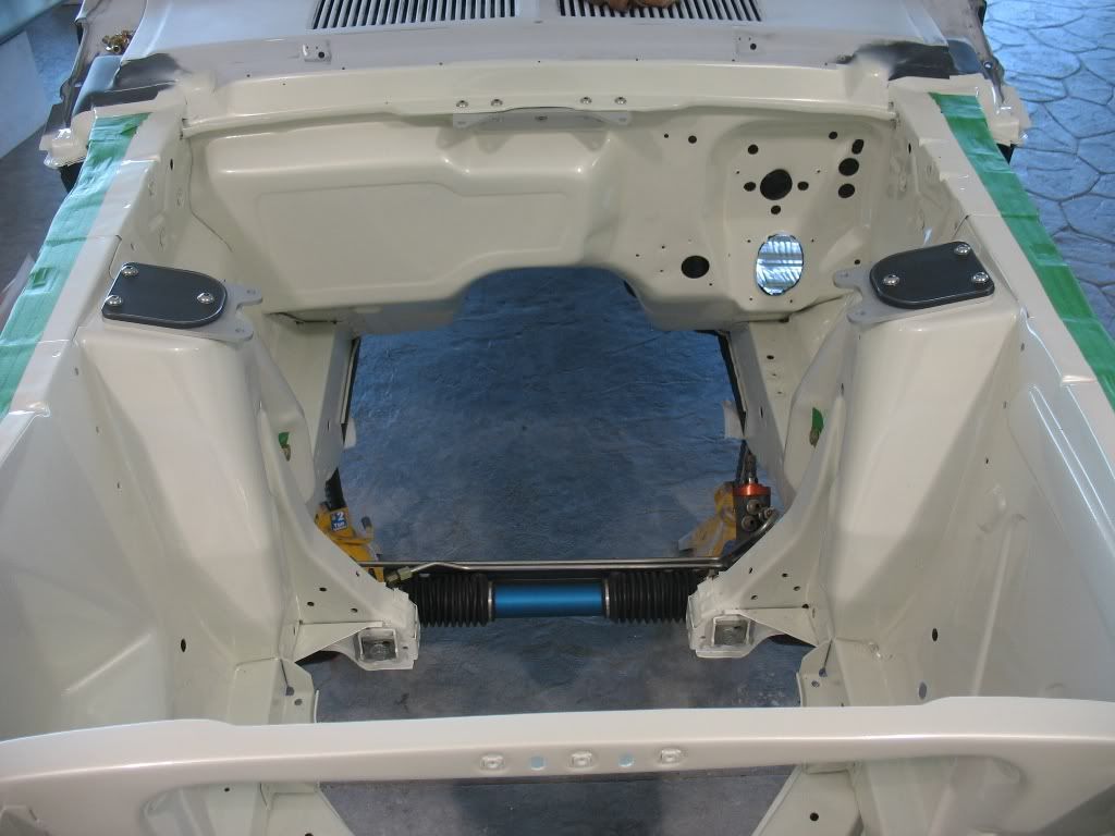 The color that the car is going to be is Ford White Chocolate. We shot the engine bay that color already. The dash and all the accessories are being done in charcoal mist, and we are doing a charcoal stripe on the bottom of the car.