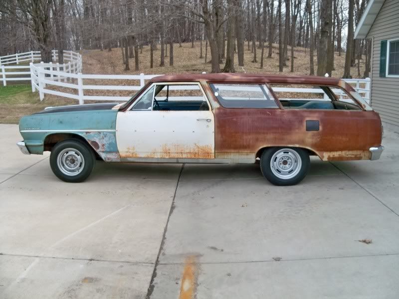 64 Chevelle Wagon, 2 Door! Its a "300" wagon, with the "LS" engine, hence the LS-300 lol Picked up a SUPER solid and complete unrestored car to start with, its gonna be nice to start with a solid car and not have to patch and make everything for a change! Only rust is in the front floor pans, few dings and dents but thats no biggie. I'm in the process of collection up parts now to start working on it. So the plans are so far, LS engine, Carburated, LQ4 short block, CNC LS3 heads, not sure of cam specs yet. Overdrive trans, prolly a 2004R, but still have not got that yet. Moser 9" ford, 3:90 gear Full air ride suspension I picked up all the suspension from a guy, had less than 500 miles on it all E3 ride pro system strong arm front control arms shockwaves front hotchkis front and rear sway bars hotckis steering arms delphi 600 power steering box air ride rear lower control arms and bags hotchkis dbl adj upper arms Planning to run 17" and 18" wheels I want to run air conditioning on this one too Black mountain precision front drive system on the engine Thats where I am at so far, not sure what all is available for the LS engines since I'm new to them. Same as brakes? I need to get dropped spindles and all the brakes. -Gary Heres some pics.... http://i19.photobucket.com/albums/b1...r/IMAG0183.jpg http://i19.photobucket.com/albums/b1...r/100_0870.jpg http://i19.photobucket.com/albums/b1...r/100_0869.jpg http://i19.photobucket.com/albums/b1...r/100_0867.jpg http://i19.photobucket.com/albums/b1...r/100_0868.jpg http://i19.photobucket.com/albums/b1...r/100_0861.jpg |