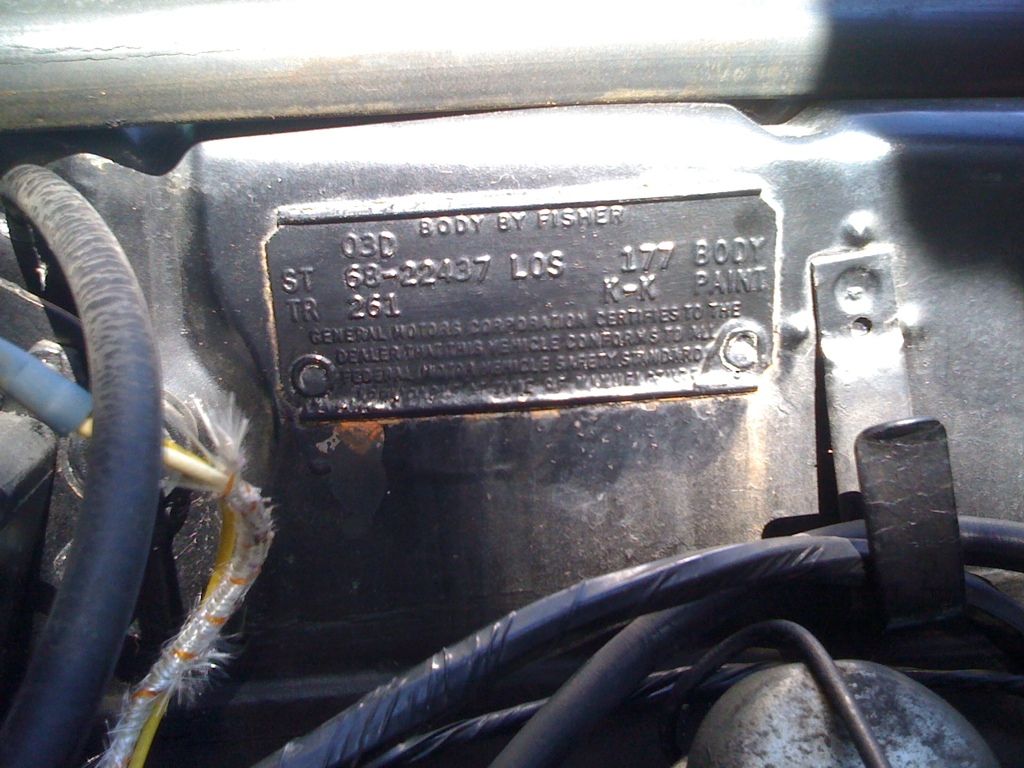http://img.photobucket.com/albums/v2...d/f0e30c1d.jpg http://img.photobucket.com/albums/v2...d/6a2a0f34.jpg Per the first gen site tag decoder: used the site decoder here is the info on the tag: The color is meridian turquoise metallic color what matches the color in the inside and outside of the car. http://firstgenfirebird.org/firebird/1968/body_tag.html 1968 Pontiac Firebird Coupe The paint was Meridian Turquoise with Meridian Turquoise upper body color. The trim color and material were Dark Turquoise Vinyl. This car has the Fisher Body Unit Number 177 built in the 4th week of March at the Van Nuys, California plant. BODY BY FISHER 03 D ST 68- 22437 LOS 177 BODY TR 261 KK PAINT GENERAL MOTORS CORPORATION CERTIFIES TO THE DEALER THAT THIS VEHICLE CONFORMS TO ALL FEDERAL MOTOR VEHICLE SAFETY STANDARDS APPLICABLE AT TIME OF MANUFACTURE. |