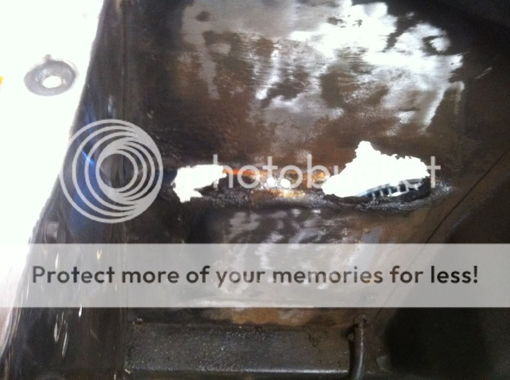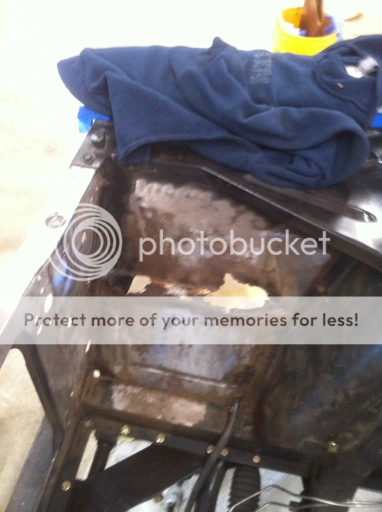 I started tearing down the engine compartment and found some rust around the battery tray area. This area was buried under what looked like roof cement:(