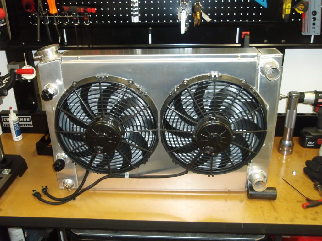 This is a dual pass PRC standard width 1st gen camaro radiator with dual 12" spals. It also has a built in heat exchanger. The fans are wired with Delphi water proof connectors. It comes with the radiator cap shown.