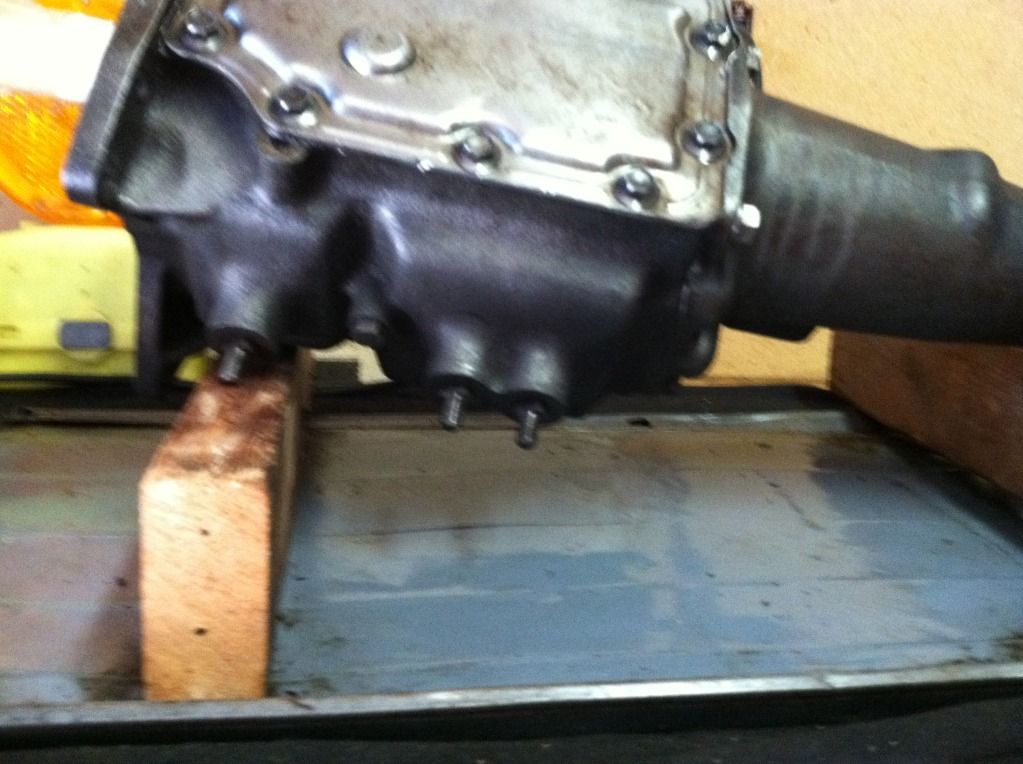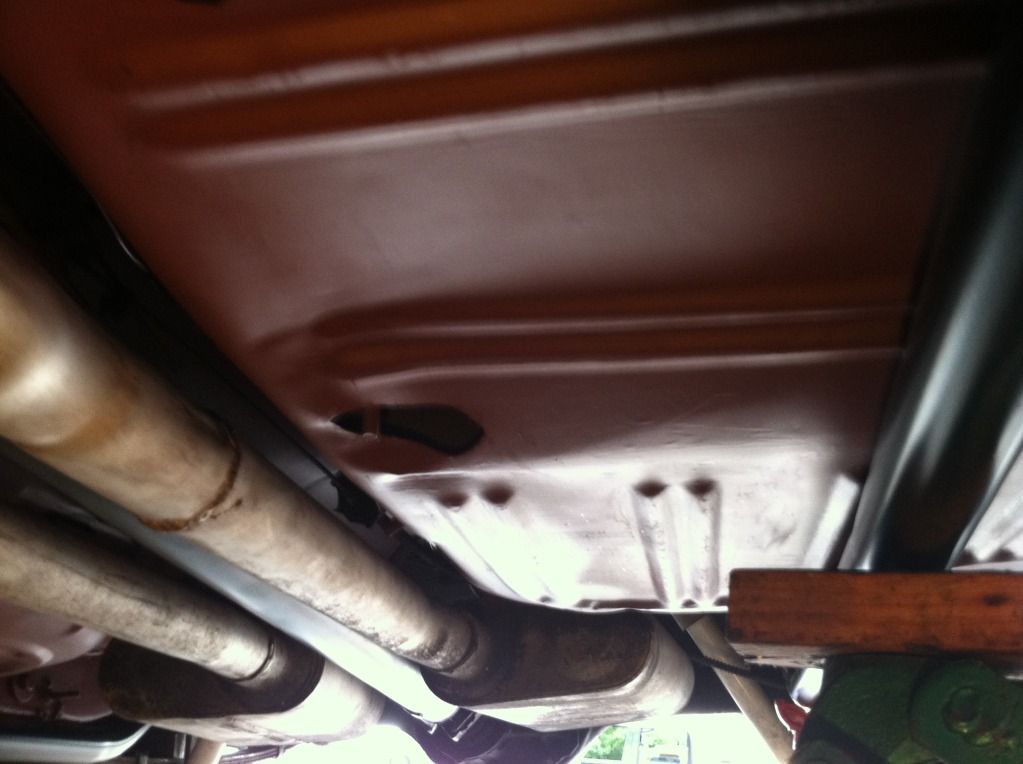 One of the next things I did was sand down the undercar and put Maier Racing subframe connectors on that drastically stiffened up the car. After I had the floor all sanded down i pulled the tranny and put a rebuilt top-loader 4speed in with a hurst super shifter. I also painted the drive shaft then painted the under car.
