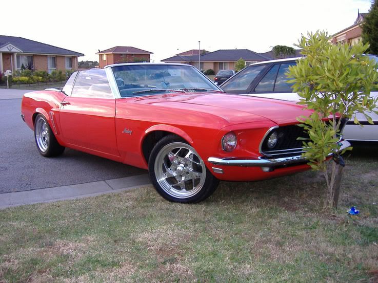 since you guys like seing pics and it is an american muscle car site, here are some pics of my cousins 69 mustang convertable, imported from california car still left hand drive (Australia is RHD) car was in not the best of conditions... stripped it down n started from scratch, re done the inside in tan leather, ripped out the 289 n threw in a 302, resprayed in candy apple red, 17" twister billets, x2 15" subs etc... with more work on the way to make this thing tougher...