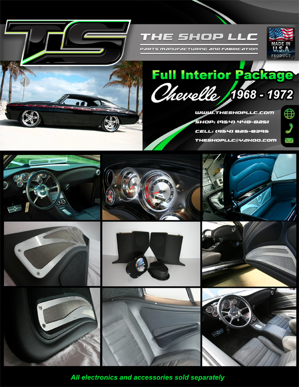 http://i281.photobucket.com/albums/k...ALGFEATURE.jpg **The Shop, LLC is offering 1968-1972 Chevelle custom mail order production interior for your Chevelle. Included from front to back: **Dash with gauge cluster a/c vents, aluminum defrost vent with mesh, a/c ducts for defrost **Kick panels with speaker enclosures for 6.5 inch speakers, Focal Access speakers included with kick panels **Two piece center console with functional lid and storage compartment, double din opening for multi media station **Door panels with billet pull handle, metal insert with mesh, arm rest **Rear quarter panels with insert and arm rest **Package tray with metal insert allowing for multiple audio configurations one pair of Focal Access speakers included **Molded trunk lid **Trunk kit with metal insert and removable side panels for battery and storage **Dash, and all panels come fully wrapped ready for installation, along with all mounting hardware and instructions **All electronics,seats,a/c, gauges,power windows, switch's,steering wheels, columns,audio and multimedia stations sold separately. Audio upgrades available (Navigation,sub woofers, speakers,amplifiers, sub-woofer enclosure). Please contact Clint at The Shop LLC for details and ordering http://www.theshopllc.com/ ***954-440-0251*** https://www.facebook.com/pages/The-S...03853559705438 http://i281.photobucket.com/albums/k...C/WEBFLYER.png http://i281.photobucket.com/albums/k...LLCPRODUCT.png http://i281.photobucket.com/albums/k...ps5ac65826.jpg http://i281.photobucket.com/albums/k...ps56e6e07f.jpg http://i281.photobucket.com/albums/k...ELLCDASH-1.jpg http://i281.photobucket.com/albums/k.../SEMA_2008.jpg http://i281.photobucket.com/albums/k...SHOPLLC/12.jpg http://i281.photobucket.com/albums/k...ESHOPLLC/3.jpg http://i281.photobucket.com/albums/k...SHOPLLC/15.jpg http://i281.photobucket.com/albums/k...HOPLLC/2-2.jpg http://i281.photobucket.com/albums/k...ESHOPLLC/7.jpg http://i281.photobucket.com/albums/k...HOPLLC/5-1.jpg http://i281.photobucket.com/albums/k...HOPLLC/1-2.jpg http://i281.photobucket.com/albums/k...HOPLLC/4-1.jpg |